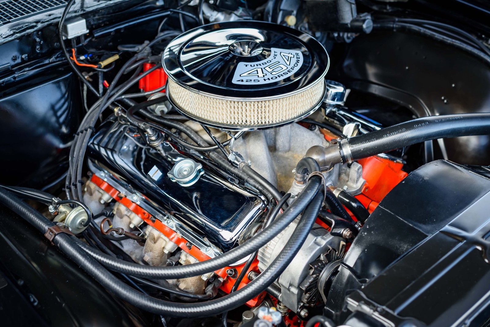 Under the working cowl-induction hood, in the tidy engine bay, sits the Chevy big-block engine between brand-new inner fenderwells.
