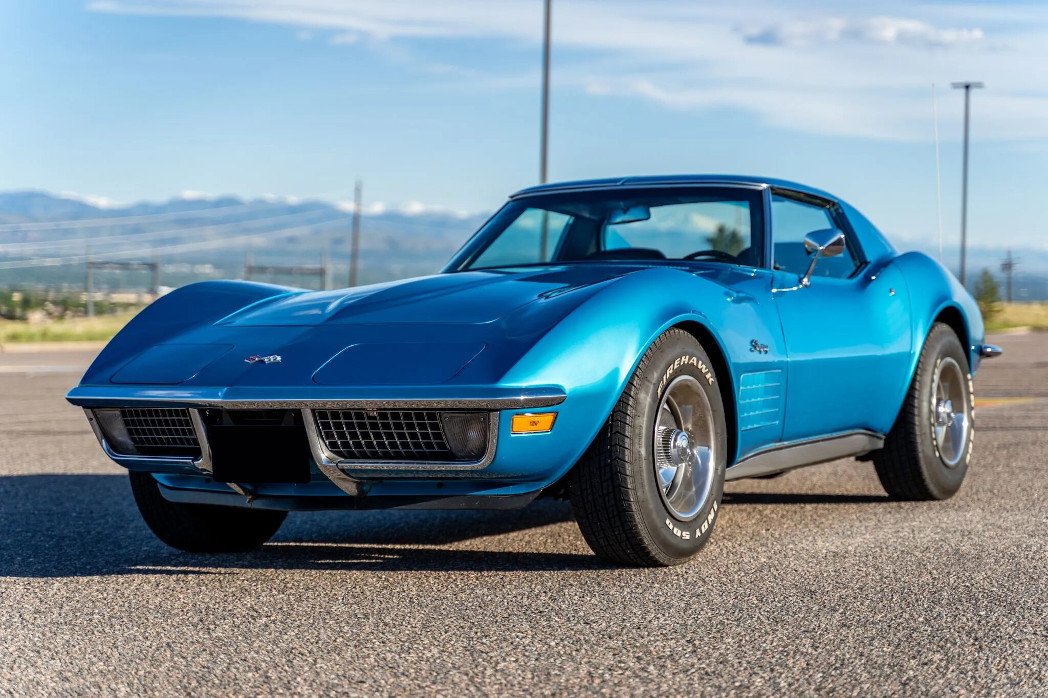 The car is finished in Mulsanne Blue over black vinyl upholstery and is powered by a numbers-matching L46 350ci V8 paired with a close-ratio four-speed manual transmission. Factory equipment includes 15″ Rally-style wheels, disc brakes, a 3.70:1 rear end, a heater, and removable roof panels.