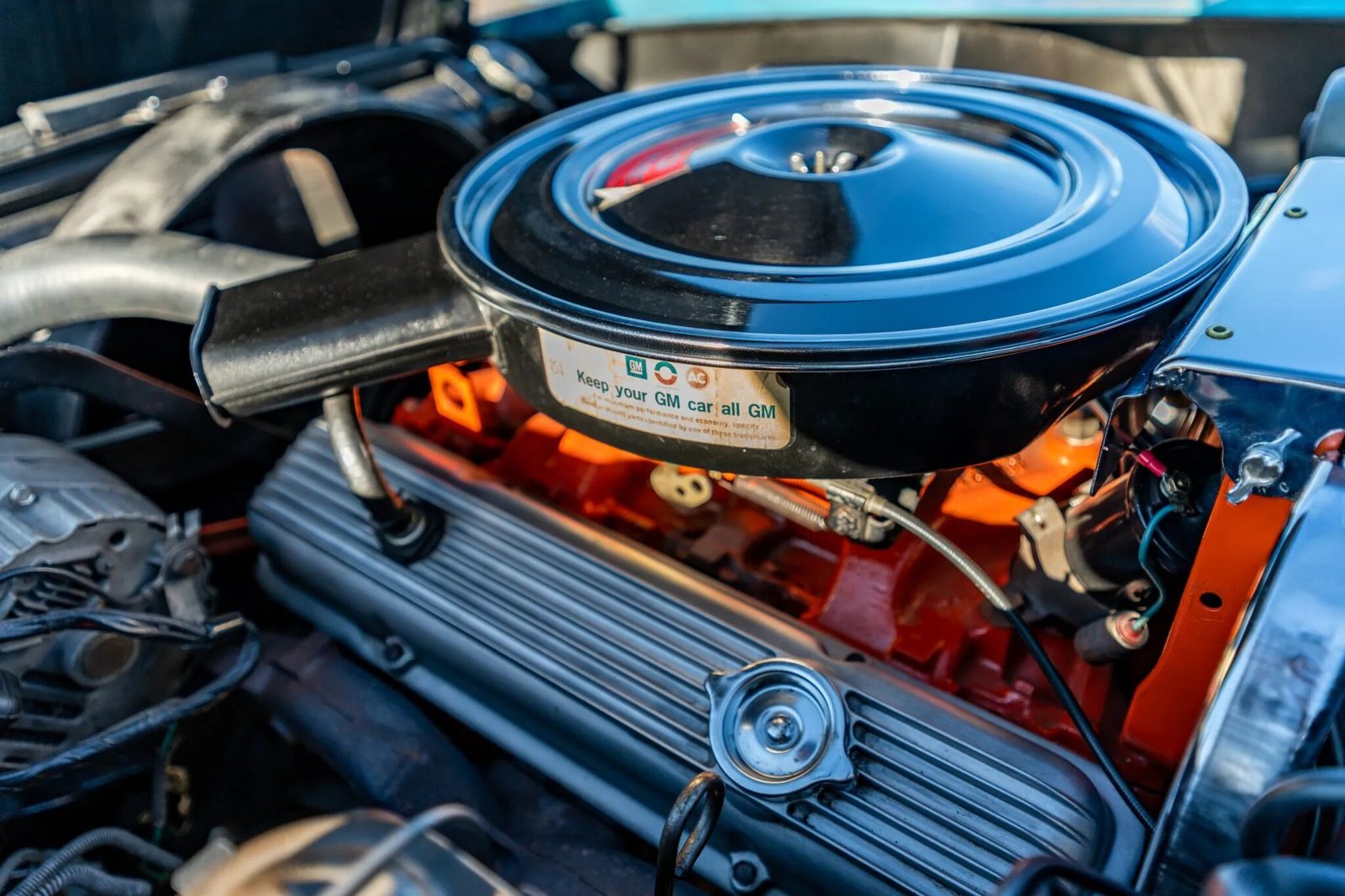 The L46 350ci V8 was rebuilt by The Bowtie Shop in 2016, which included stripping and repainting the block, resurfacing the cylinder heads, and replacing the following components: Timing chain, Oil pump & screen, Camshaft & bearings, Intake & exhaust valves, guides, seals, seats, and springs, Lifters, Piston rings, Freeze plugs, Gaskets, Accessory drive belt.