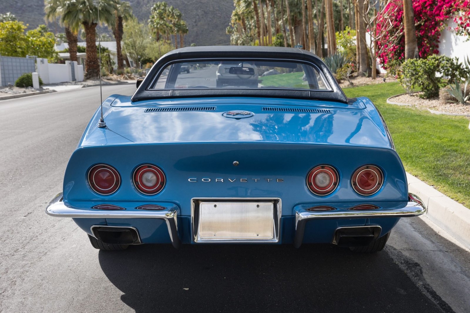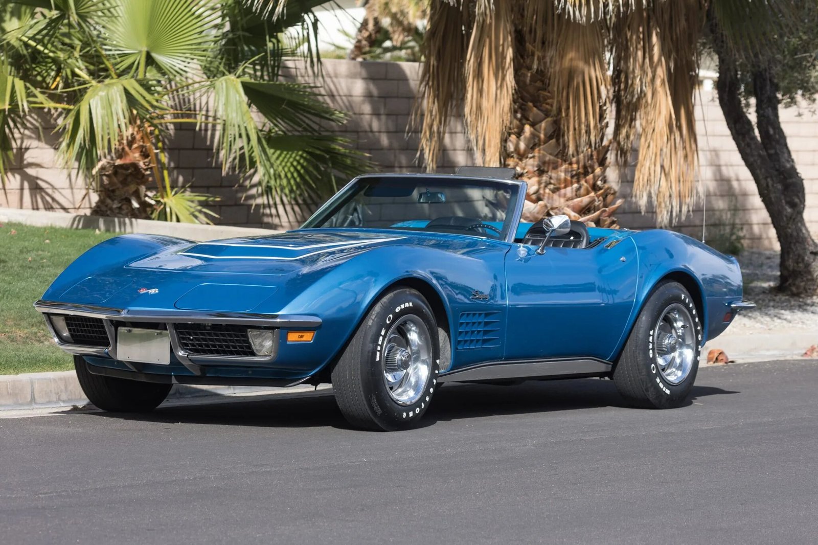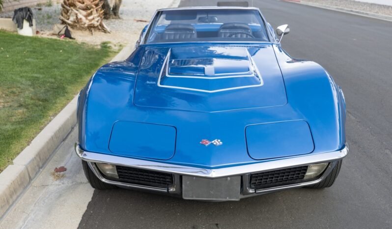 This 1970 Chevrolet Corvette convertible is powered by a 350ci LT-1 V8 mated to a Muncie four-speed manual transmission and a Positraction rear axle. The car was refurbished and it is finished in Mulsanne Blue Metallic over a black vinyl interior, and additional equipment includes a white convertible soft top, a removable black vinyl hardtop, a vented hood, pop-up headlights, 15″ Rally wheels, four-wheel disc brakes, an Edelbrock carburetor, power windows, and a Delco push-button AM/FM radio.
