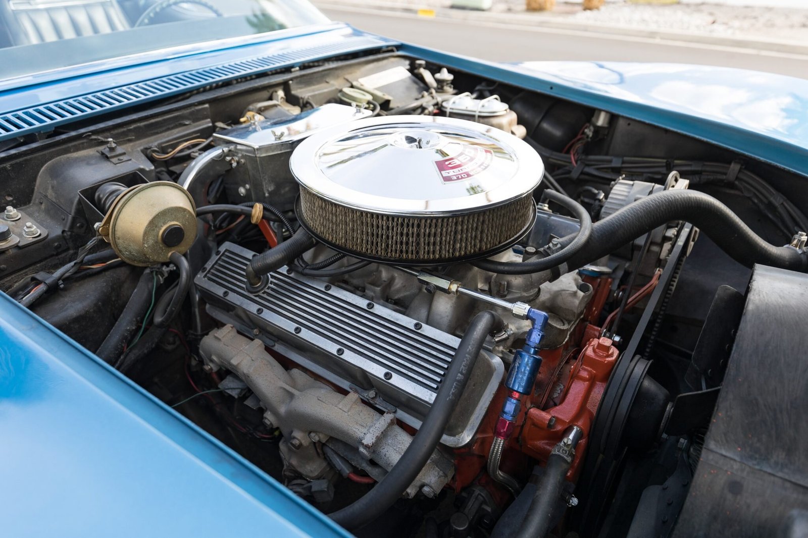 The 350ci Turbo-Fire V8 was rebuilt in 2002, modifications include an Edelbrock carburetor and fuel lines, aftermarket valve covers, and a chrome air cleaner.