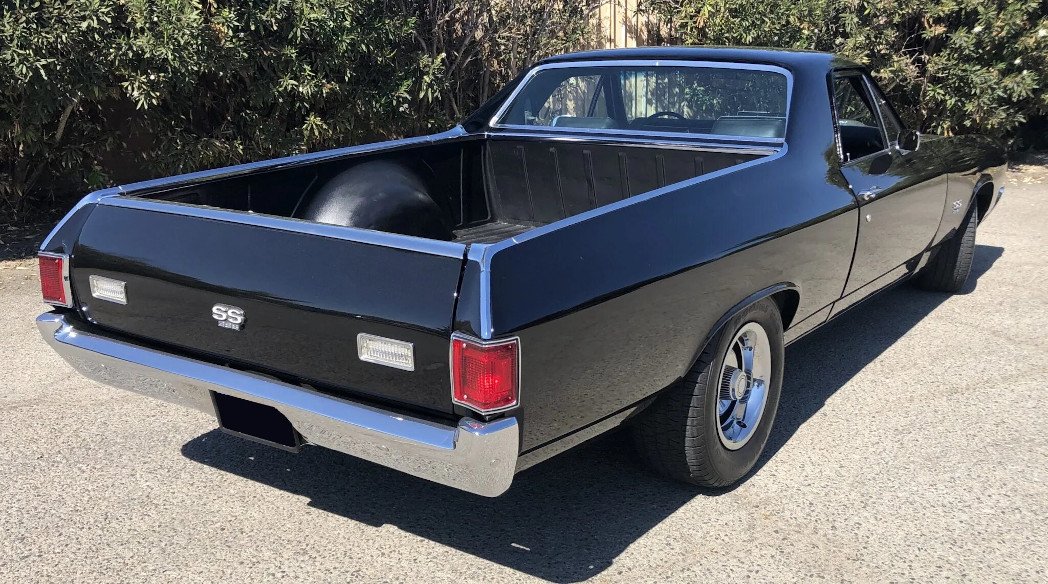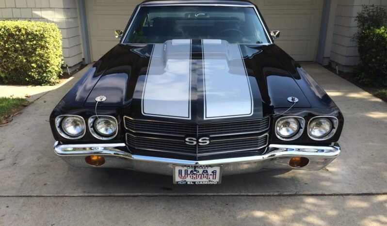 This 1970 Chevrolet El Camino SS 396 is finished in black with silver stripes over a black vinyl interior and is powered by a numbers-matching 402ci V8 paired with a four-speed manual transmission and a Positraction rear end.