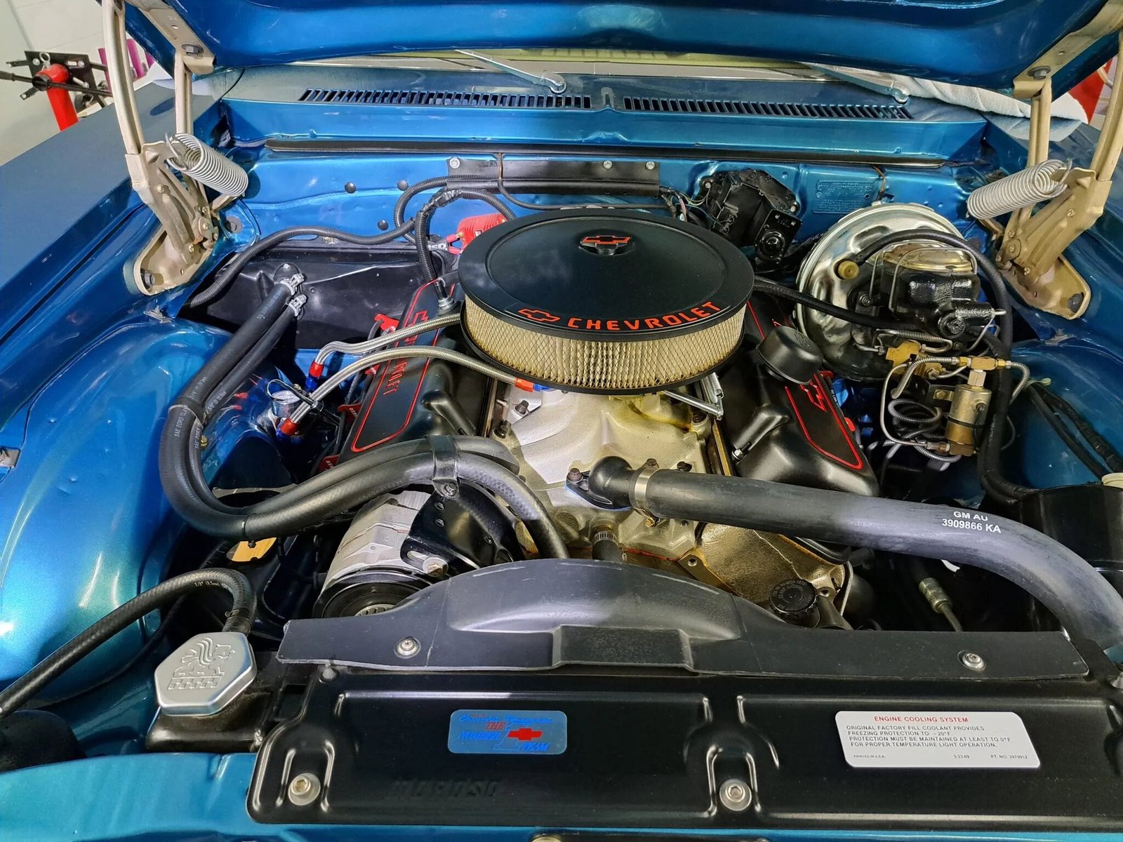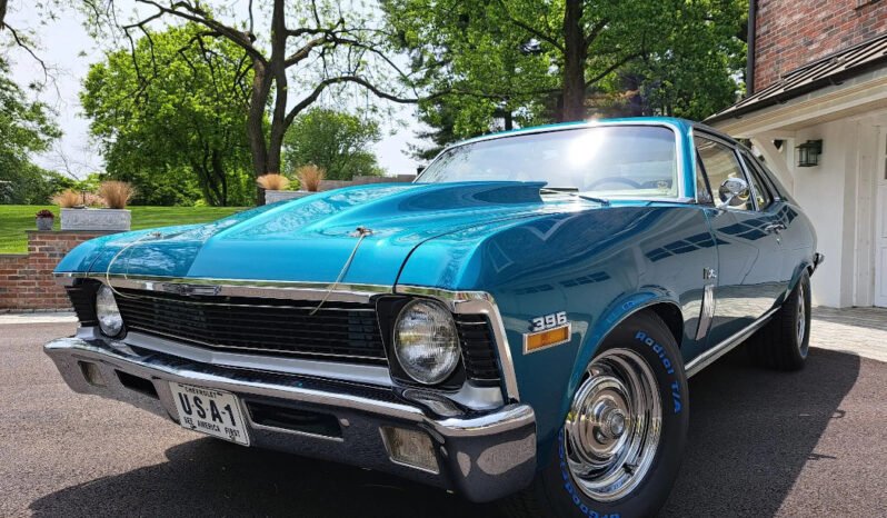 Exterior details include chrome bumpers and a Glasstek fiberglass cowl-induction hood with hold-down pins along with 396 fender badging, dual side mirrors, vent windows, and bright trim.