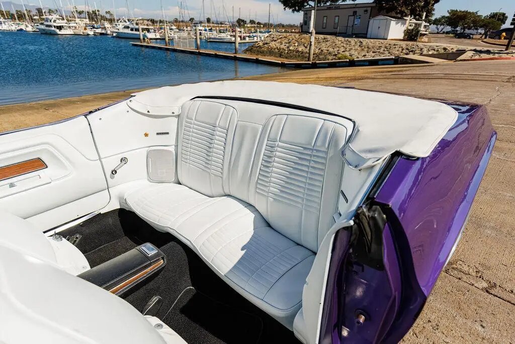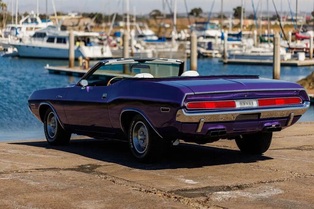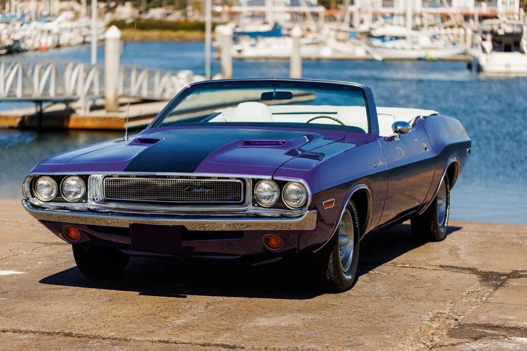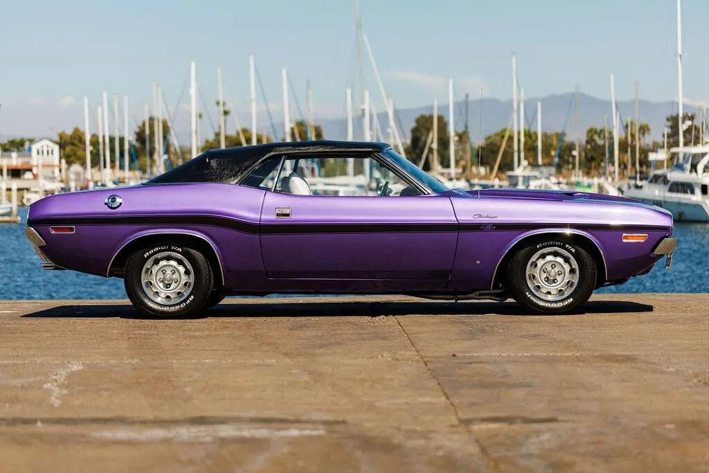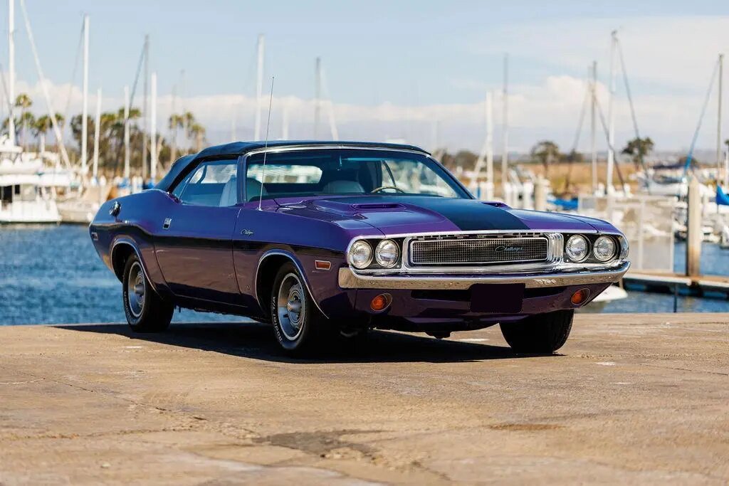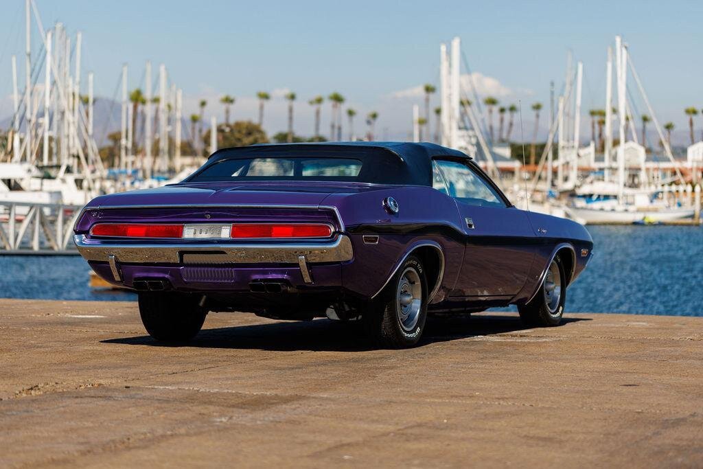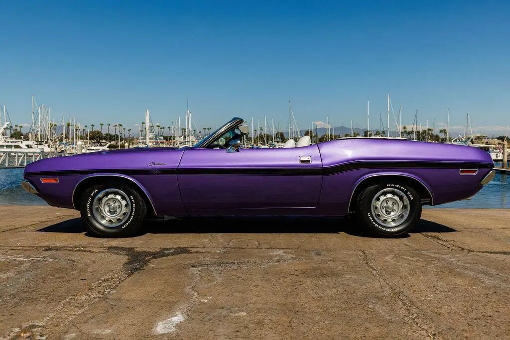 This 1970 Dodge Challenger convertible is finished in metallic purple over white vinyl upholstery and powered by a 318ci V8 paired with a three-speed automatic transmission.
