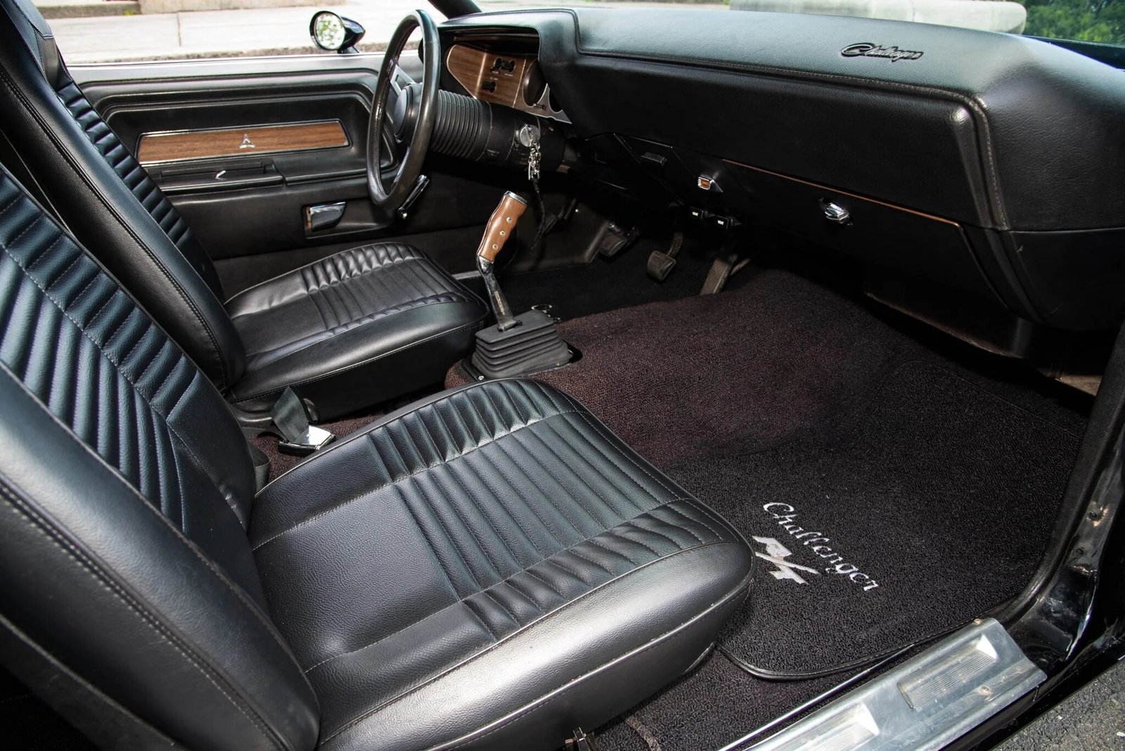 Features include a Hurst pistol-grip shifter, faux wood trim accents, Challenger R/T branded floor mats, polished door sills, and a locking glovebox.