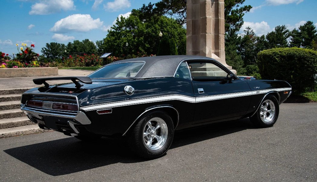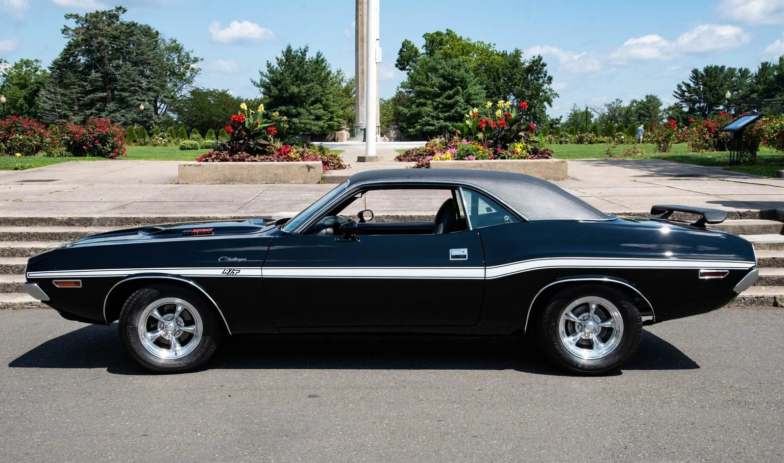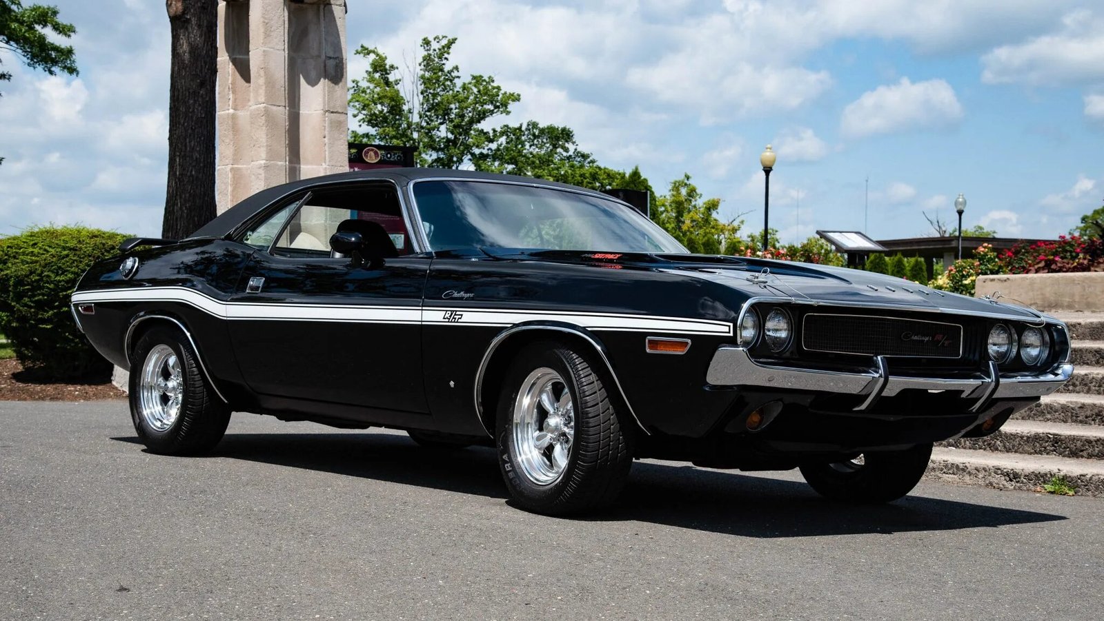 This 1970 Dodge Challenger R/T is finished in black over black and powered by a replacement 440ci V8 with a trio of two-barrel carburetors paired with an A-833 four-speed manual transmission.