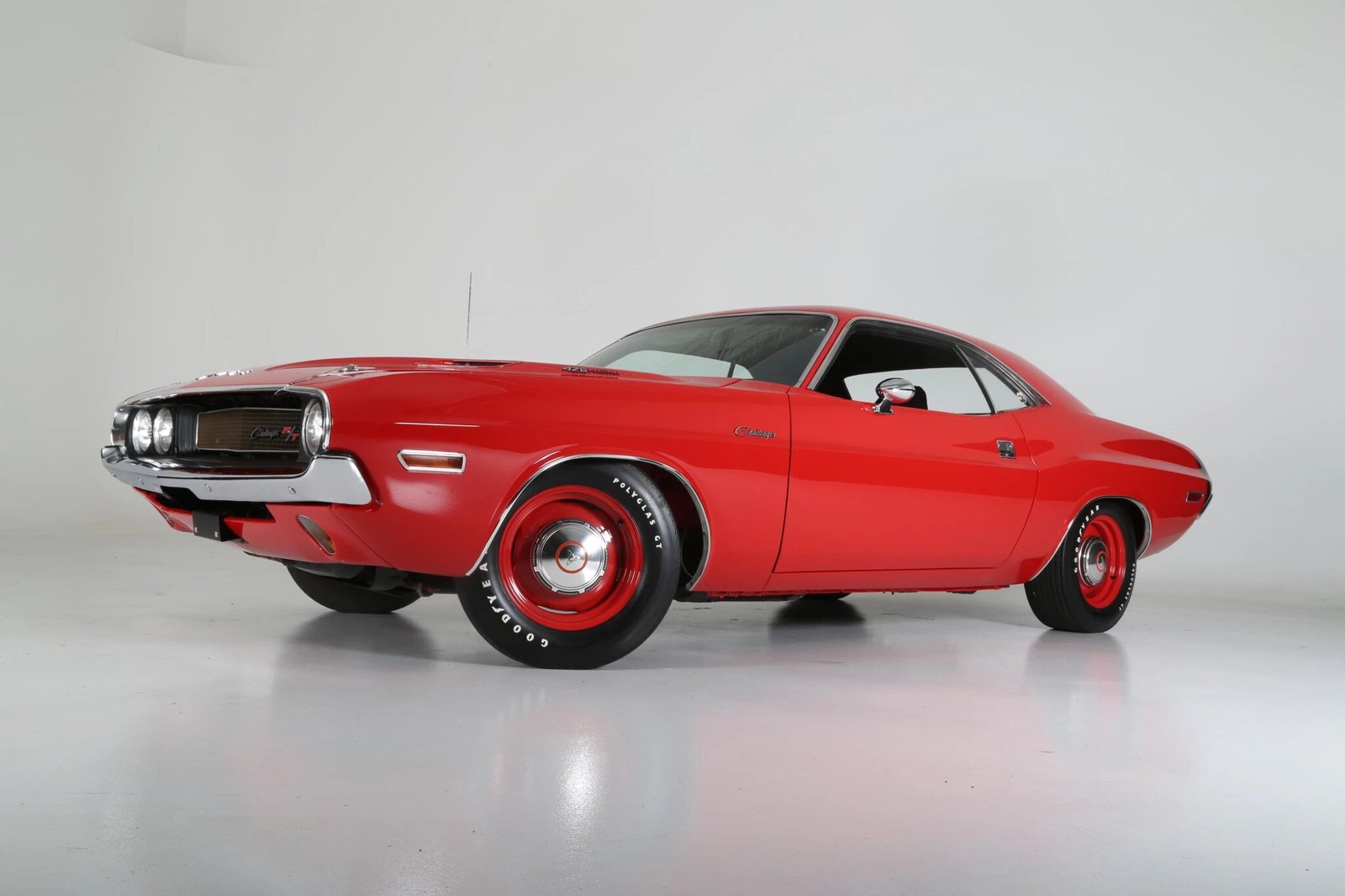 This 1970 Dodge Challenger R/T is powered by a 426ci Hemi V8 paired with a TorqueFlite 727 3-speed automatic transmission and finished in Bright Red with a black bumblebee stripe over a black vinyl interior.