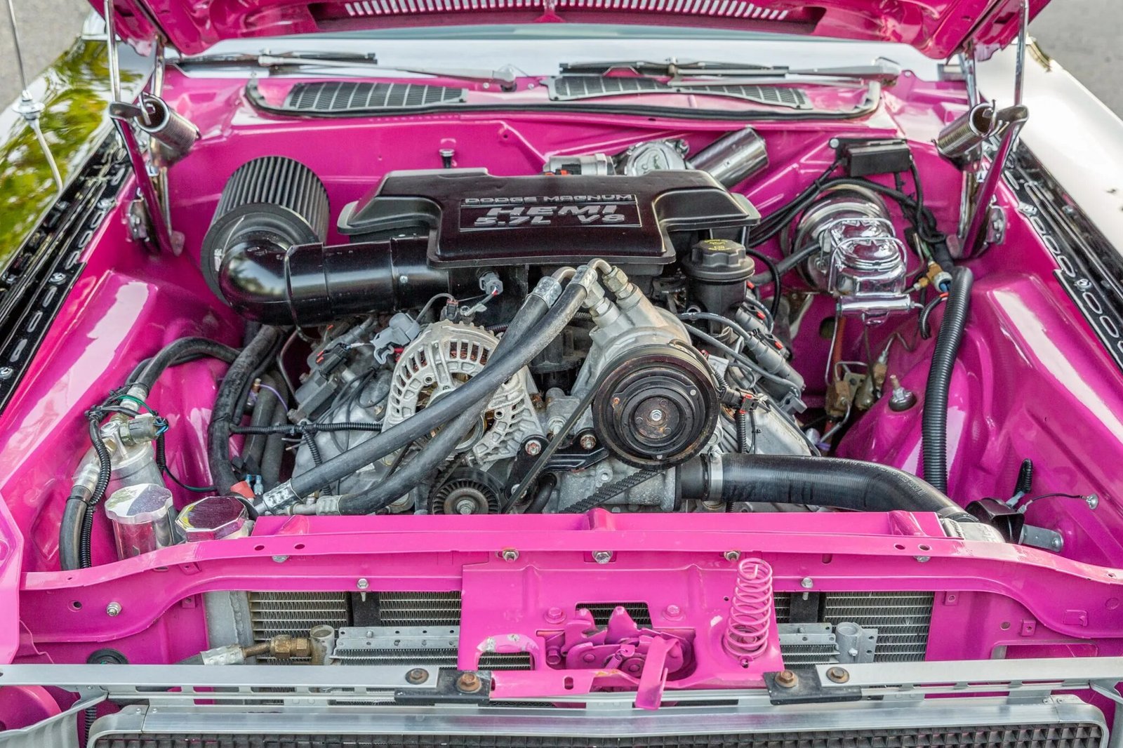 The 5.7-liter Hemi V8 and five-speed automatic transmission have been sourced from a 2005 Dodge manufacturer test vehicle.