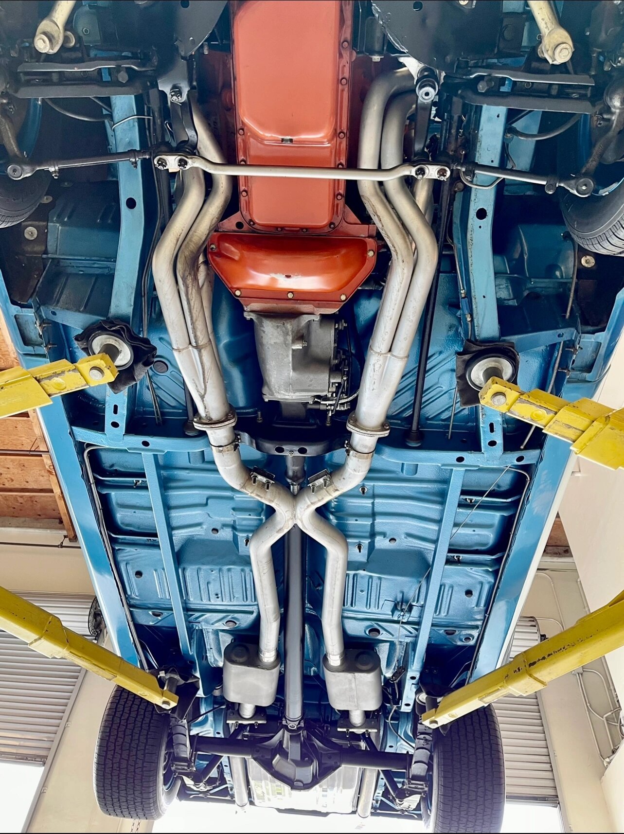 Tubular headers feed a dual exhaust system with an X-pipe.