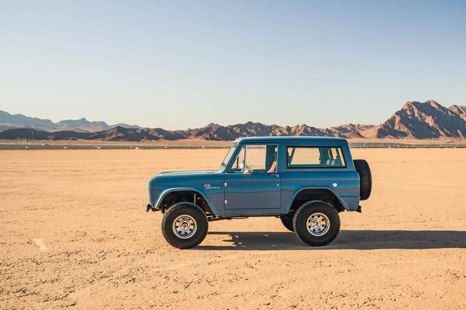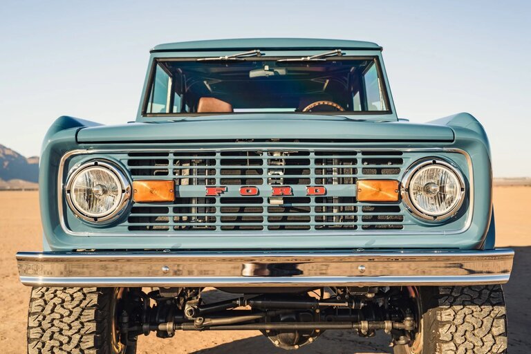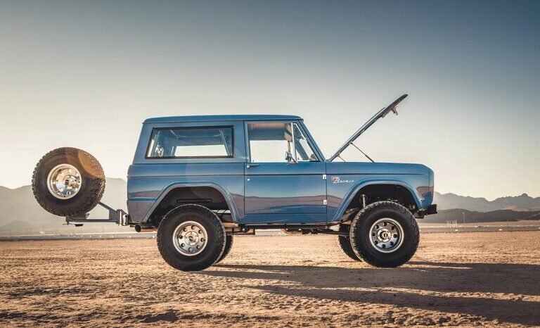 The truck is finished in Cavalry Blue over Relicate brown leather upholstery and is equipped with a fuel-injected 5.0-liter Coyote V8 paired with a four-speed overdrive automatic transmission and a dual-range transfer case.