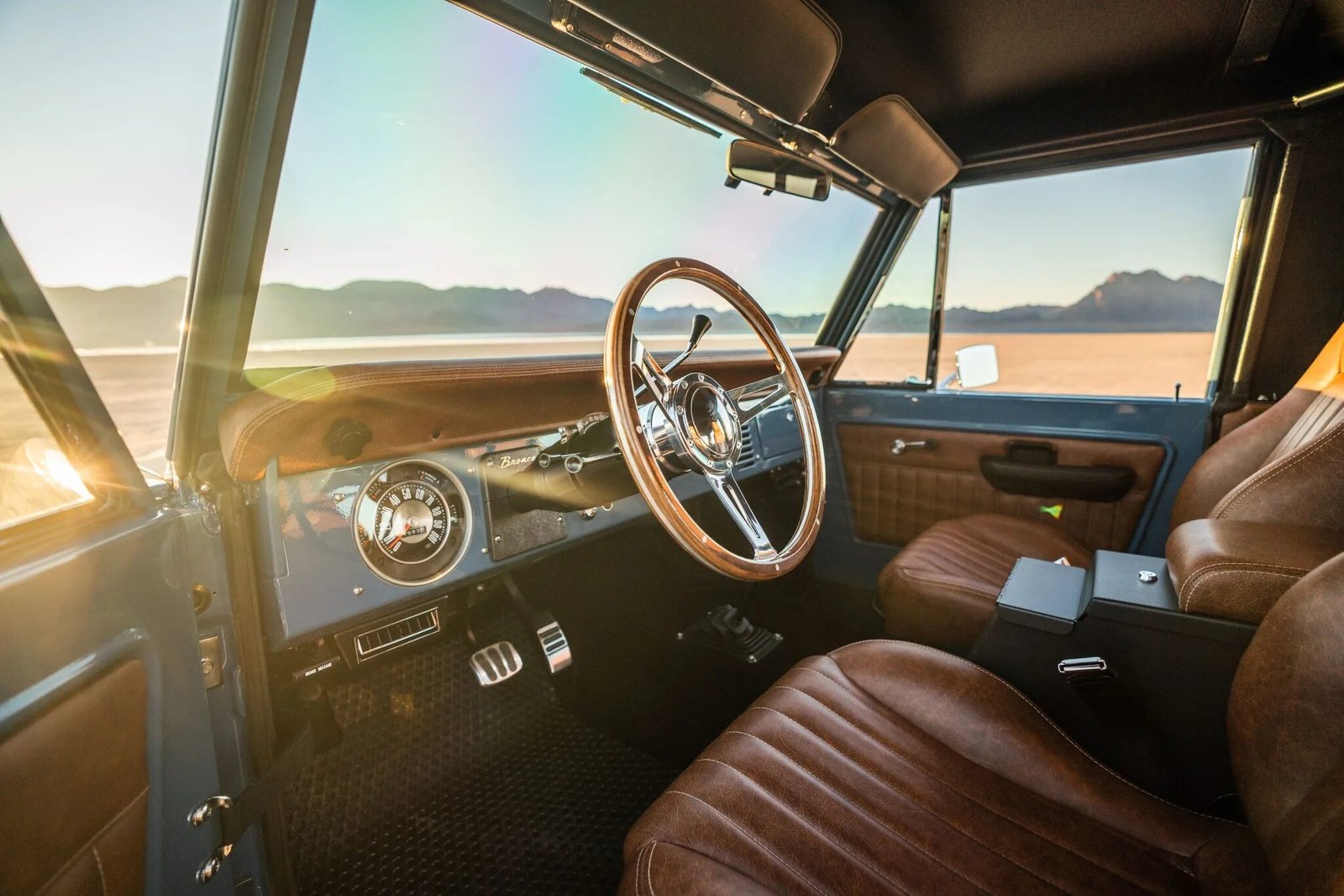 The interior is outfitted with replacement front bucket seats and a rear bench trimmed in Relicate brown leather and accompanied by a matching dashboard pad and interior panel trim.