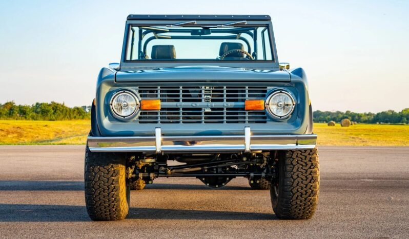 Exterior details include a black Rampage soft top, chrome-finished bumpers, a body-color grille, black fender arches, a fold-flat windshield, dual side mirrors, AMP Research power running boards, and a 3″ BC Bronco exhaust system with a single outlet.