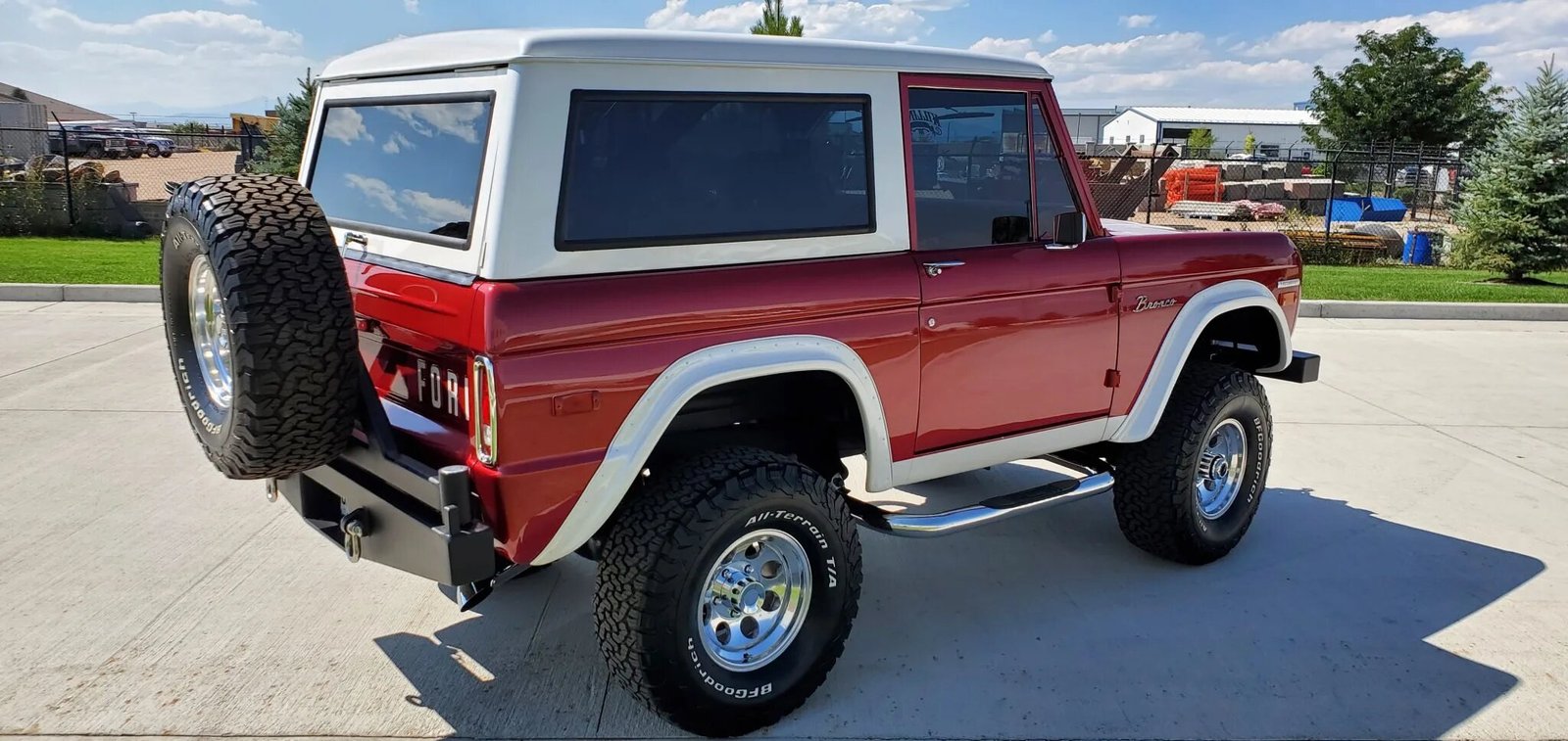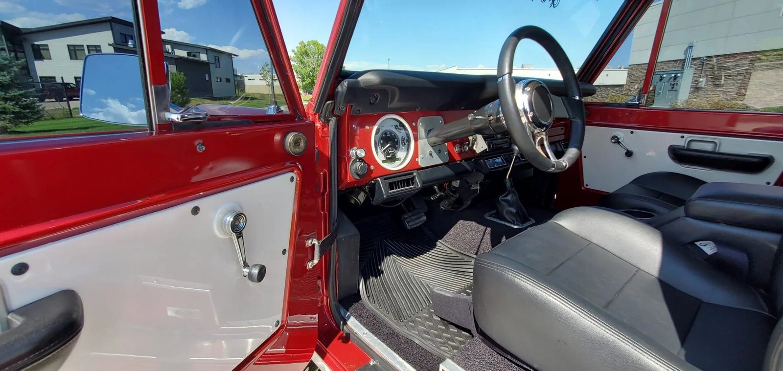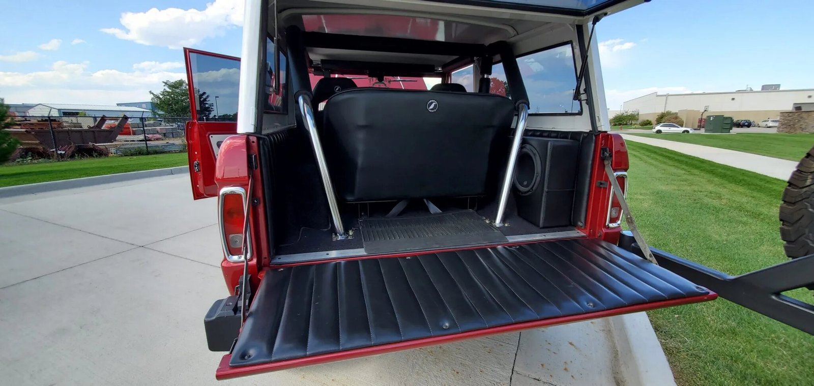 This 1970 Ford Bronco was refinished in red over black upholstery as part of a refurbishment completed in 2015, which also included the installation of a turbocharged 3.5-liter EcoBoost V6 paired with a six-speed automatic transmission and a dual-range transfer case.