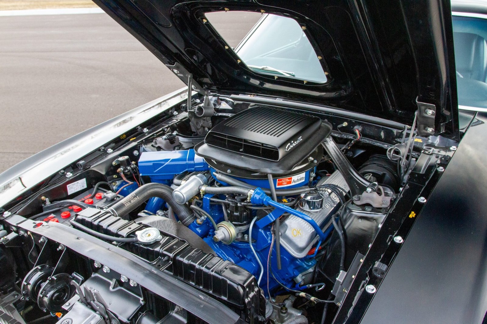 The 428ci Super Cobra Jet V8 is equipped with a shaker hood scoop perched atop a four-barrel carburetor.