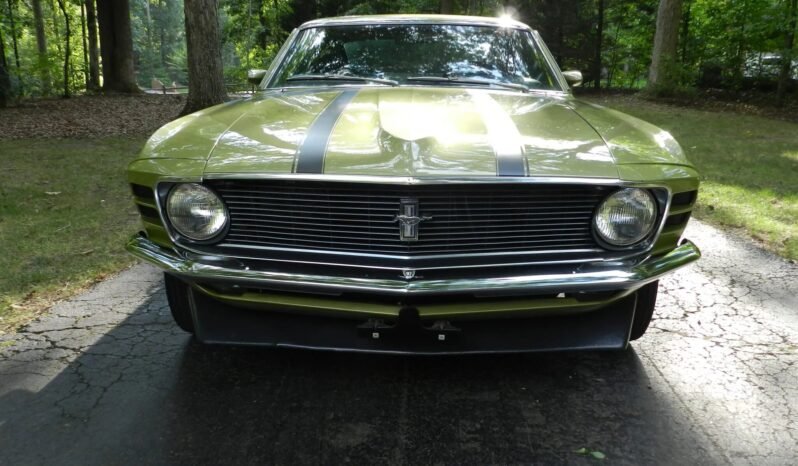 This 1970 Ford Mustang Boss 302 has been refinished in Medium Lime Metallic over Ivy vinyl upholstery. Power is provided by a 302ci V8 paired with a four-speed manual transmission, and additional equipment includes chrome bumpers, 15″ steel wheels, front disc brakes, a rear spoiler, a front air dam, and a T-handle Hurst shifter. The engine was rebuilt and the clutch was replaced in 2022.