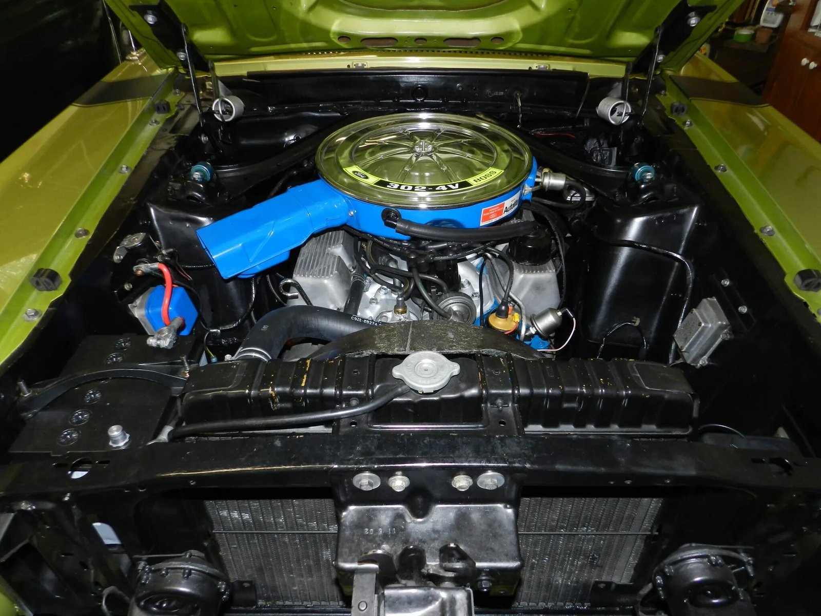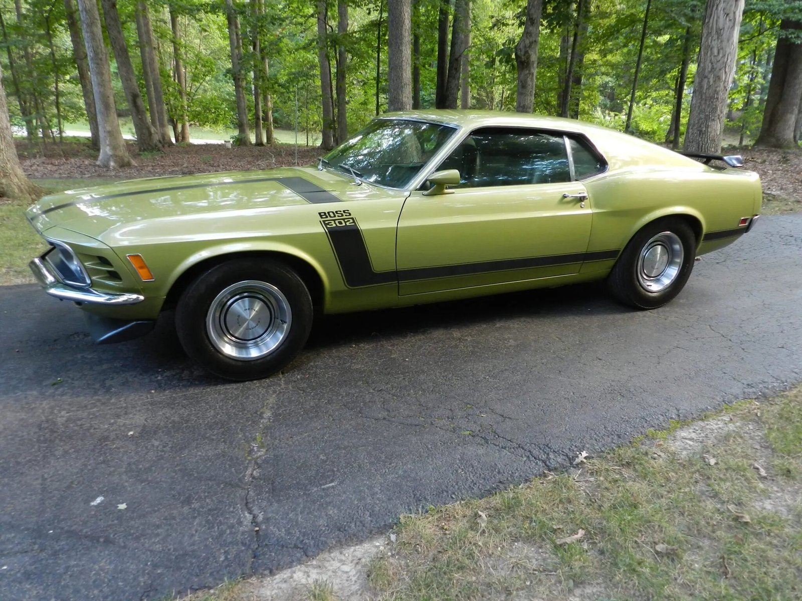 The car was originally finished in Medium Lime Metallic (G) and was refinished. The car is equipped with chrome bumpers, color-keyed racing mirrors, Boss 302 “hockey-stick” graphics, and front and rear spoilers.