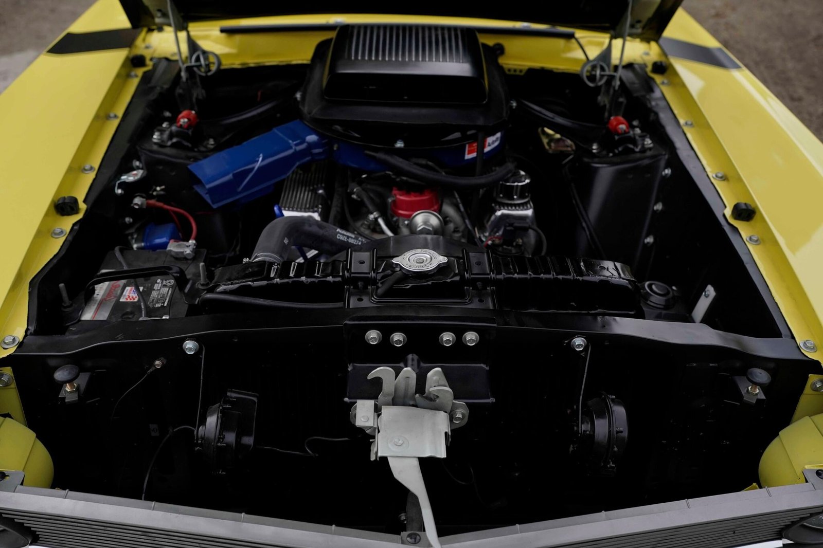 The body was refinished in its factory color of yellow (D) in 2010, exterior features include a front lip spoiler, a Shaker hood scoop, black “hockey stick” graphics, color-keyed mirrors, a black tail panel.