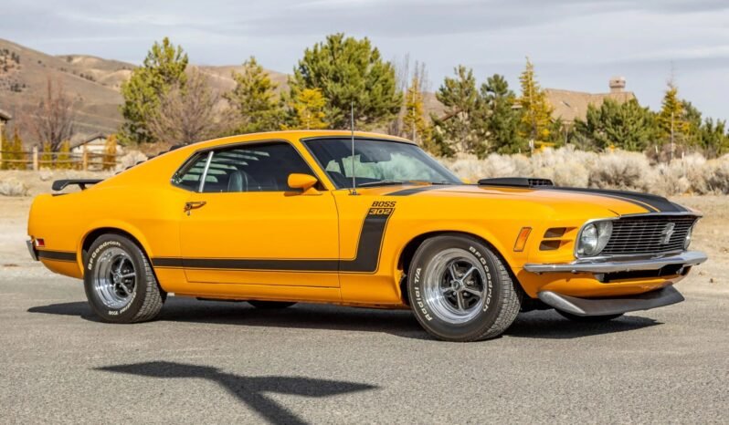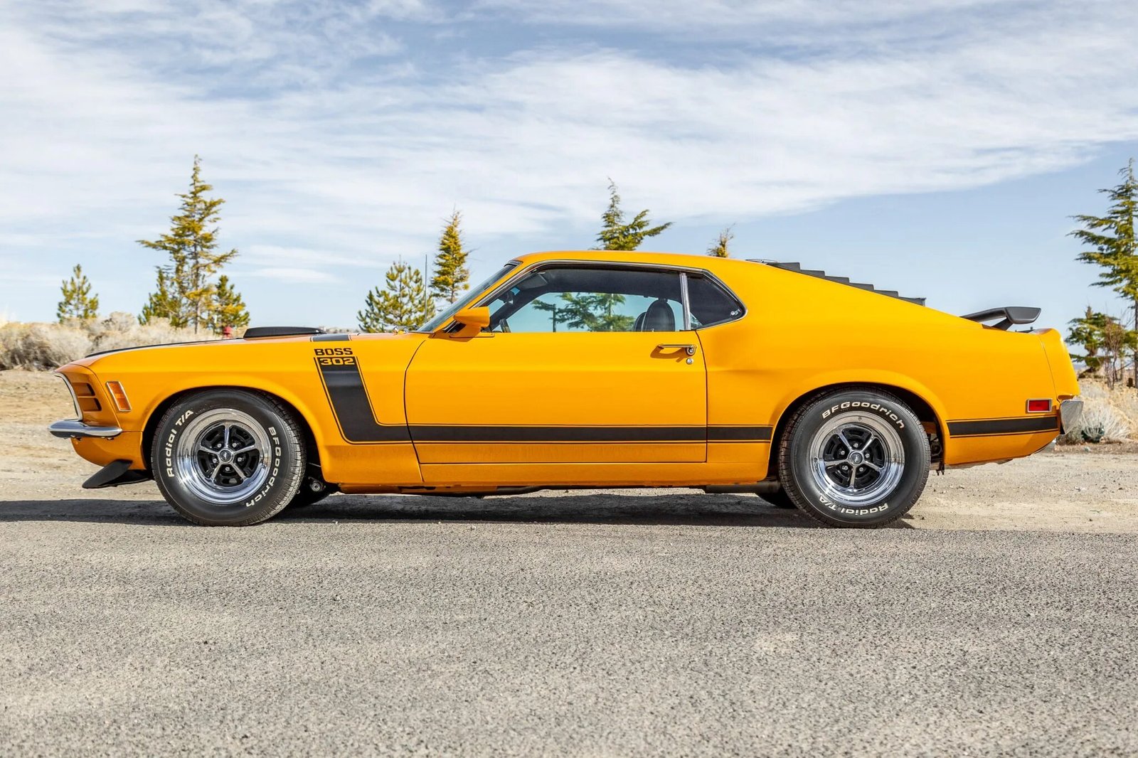 This 1970 Ford Mustang Boss 302 was refurbished around 2007 with a repaint in orange with black accents over a black interior, and it is powered by a 302ci V8 paired with a four-speed manual transmission.