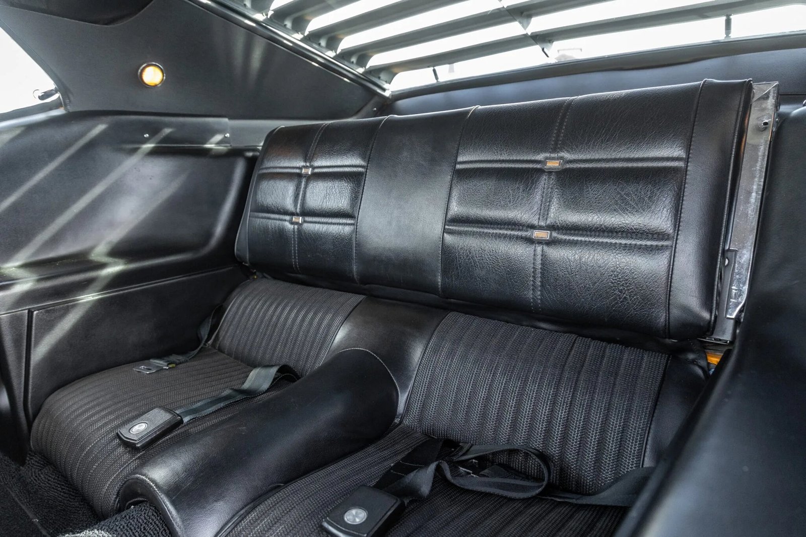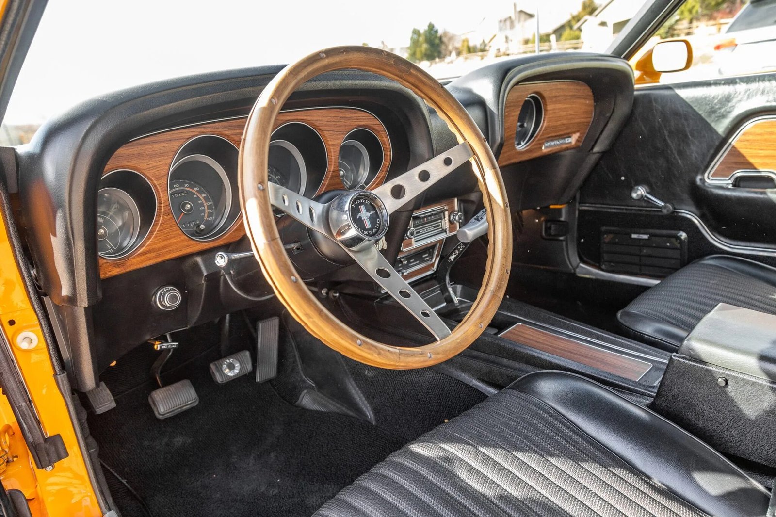Equipment includes a Mustang-branded AM radio/eight-track player, a T-handle Hurst shifter, and a clock as well as a map light on the passenger side.
