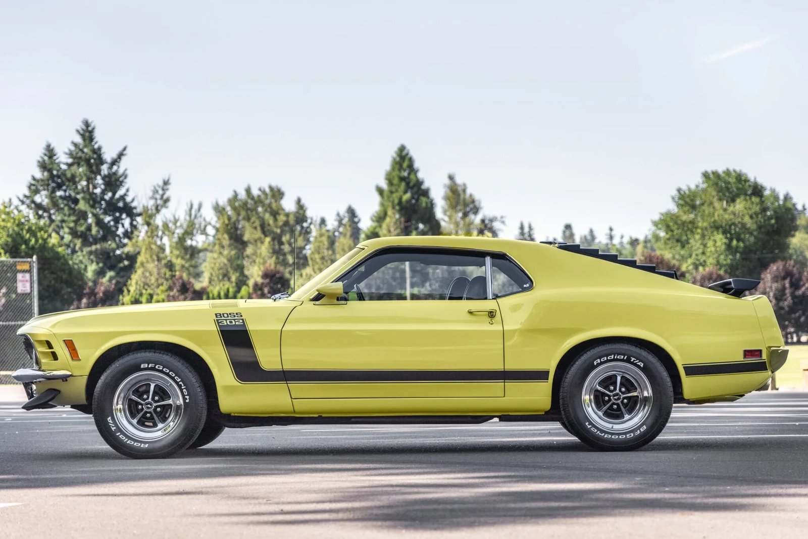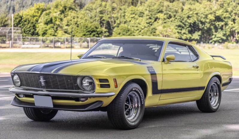 Features include black Boss 302 “hockey-stick” side stripes and hood stripes, a front spoiler, dual side mirrors, a rear spoiler, rear window louvers, and dual exhaust outlets.