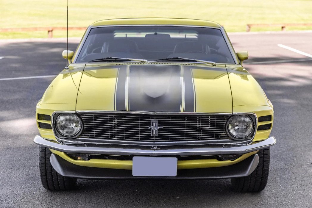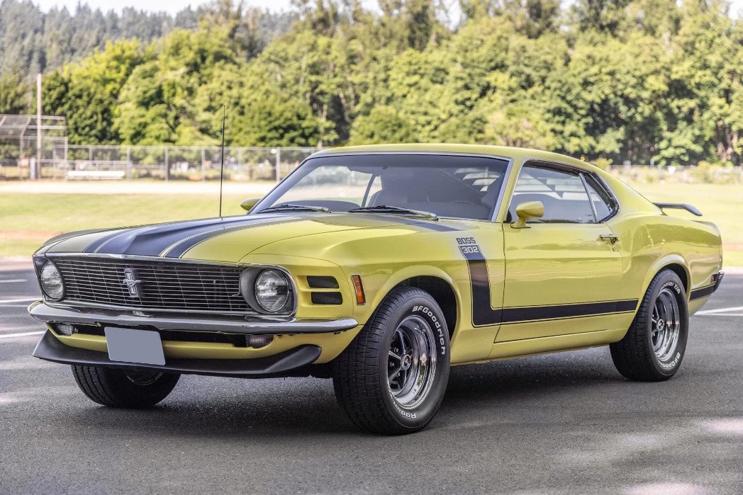 This 1970 Ford Mustang Boss 302 was built in October 1969, a subsequent multi-year refurbishment have included rebuilding the 302ci V8 and replacement four-speed manual transmission, repainting the body in yellow, and refreshing the black vinyl interior. Equipment includes a Traction-Lok differential, chrome bumpers, a front spoiler, “hockey stick” graphics, rear window louvers, a rear spoiler, 15″ wheels, a heater, a Hurst shifter, Classic Auto Air climate control, a RetroSound stereo, and Hertz speakers.