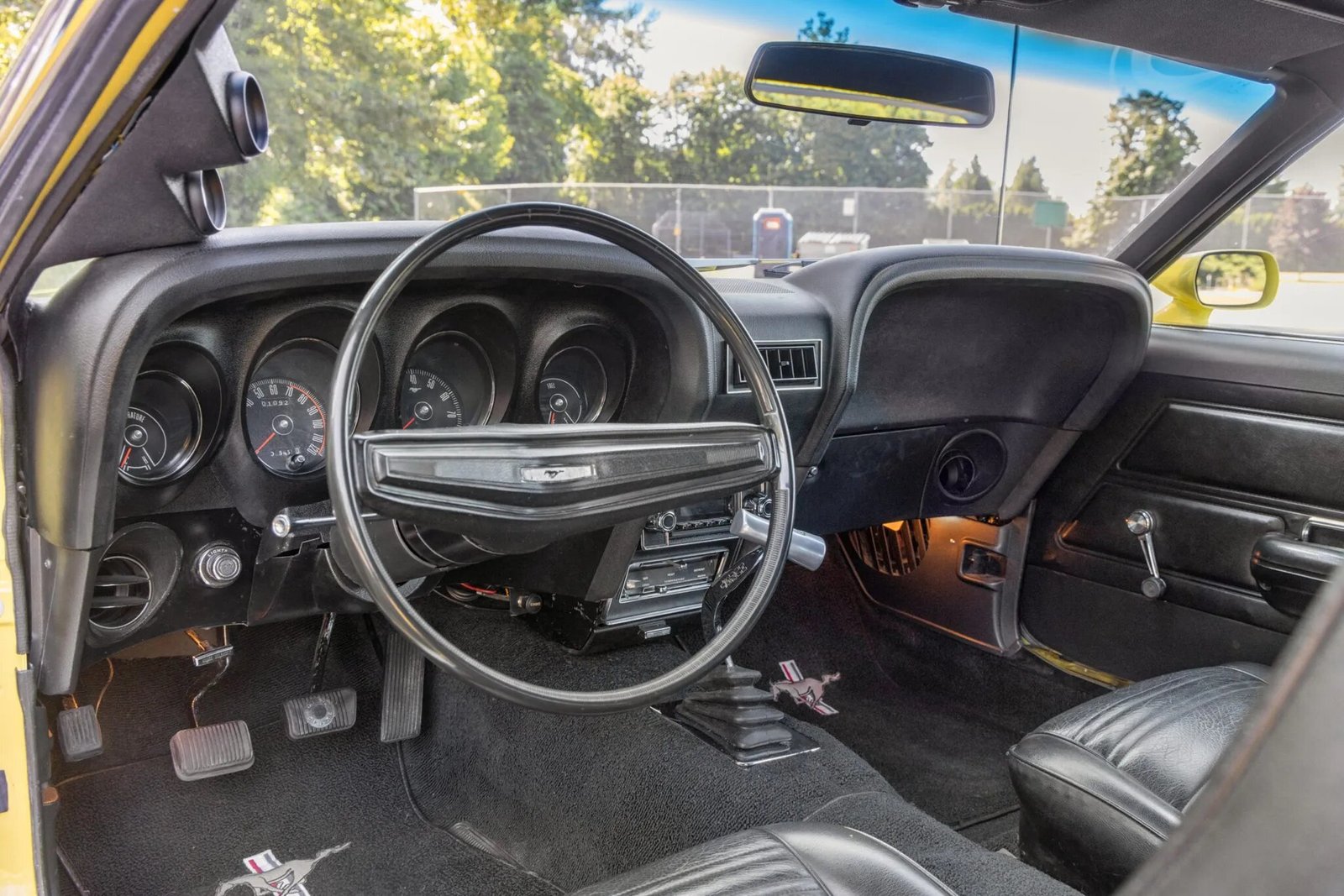 Additional appointments include a Hurst T-handle shifter, Mustang-branded floor mats, Classic Auto Air climate control, a RetroSound stereo, and Hertz speakers.