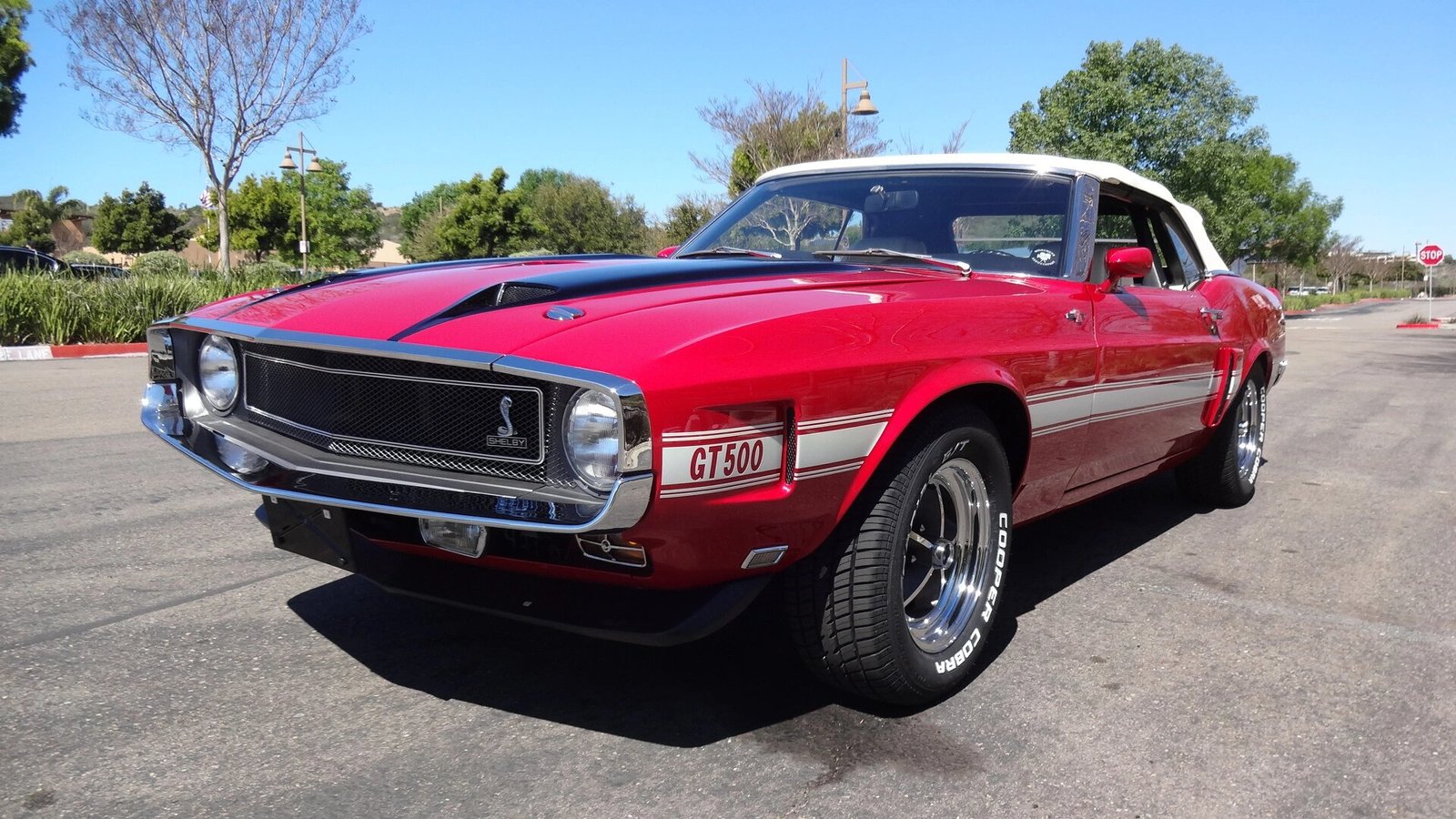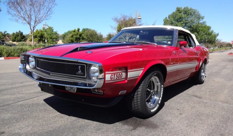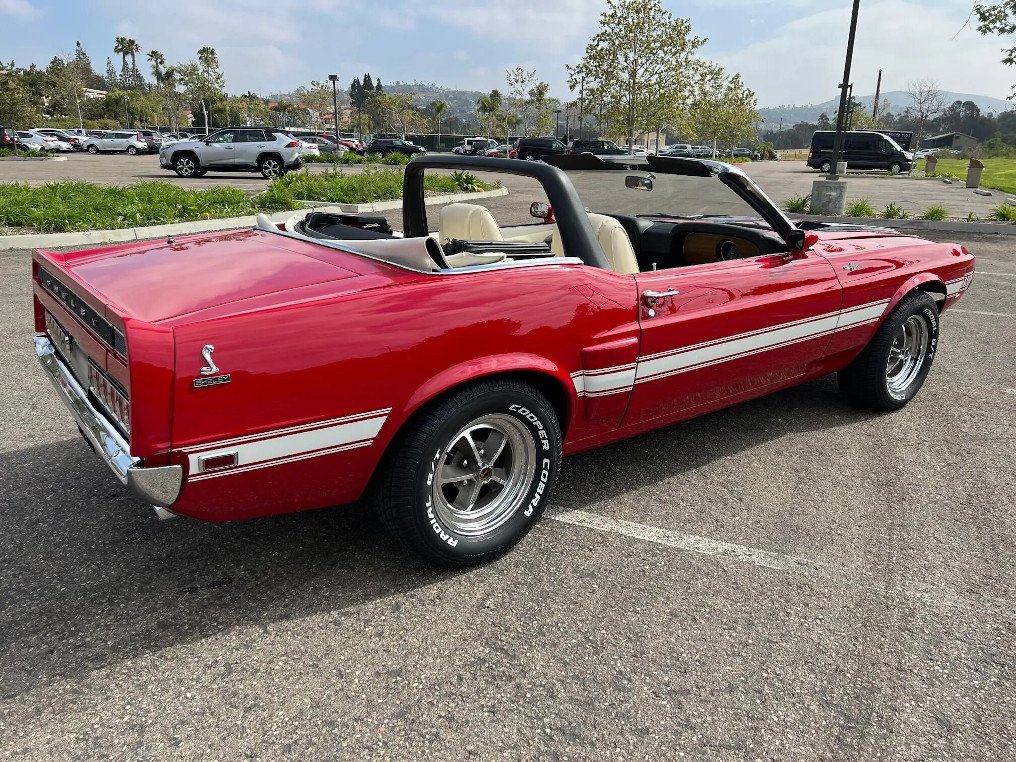 Additional features include a power-operated white soft top, hood vents, front and rear spoilers, GT500 and Shelby badging, color-keyed side mirrors, and a dual-exit exhaust.