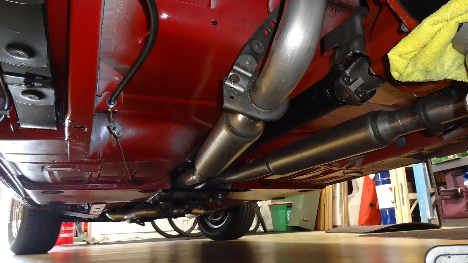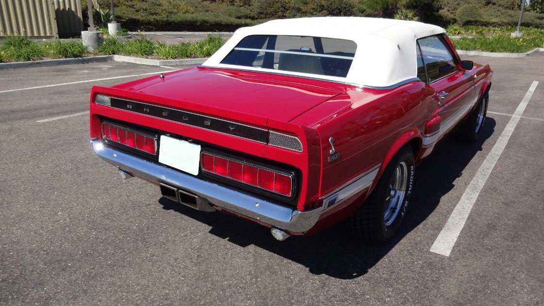 Tony Branda-sourced GT500 body panels were installed before the body was repainted in Candy Apple Red with white side stripes and black hood stripes in 2010.