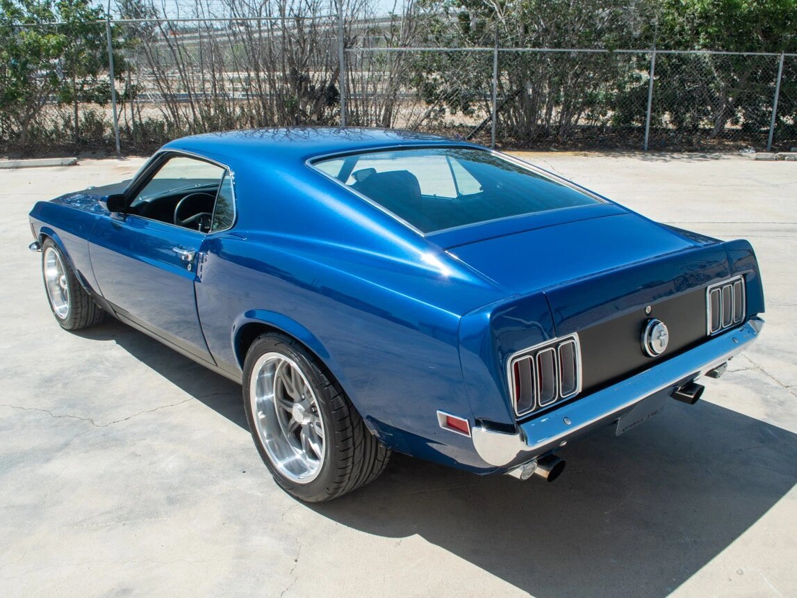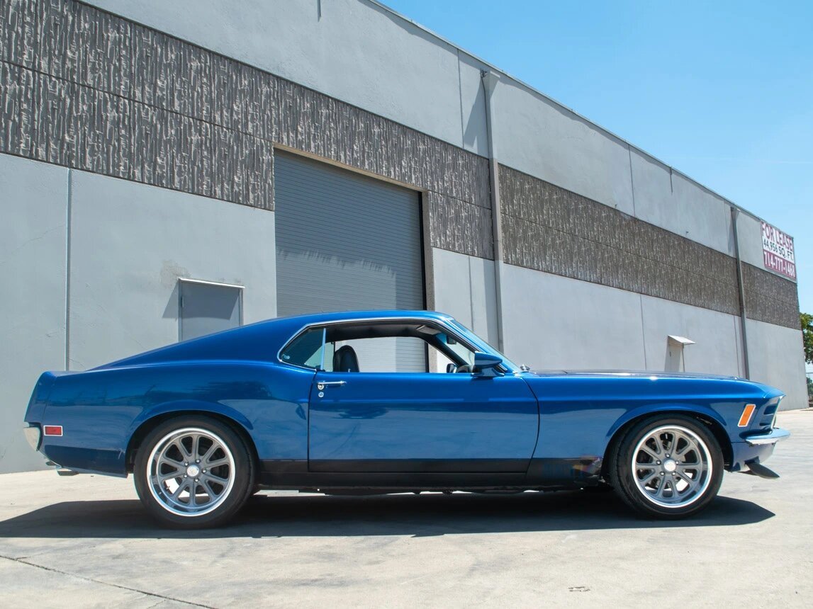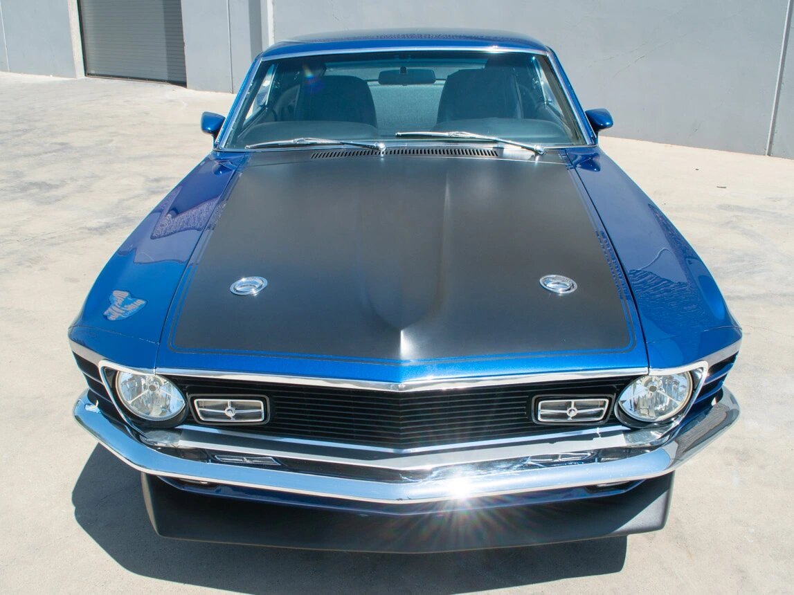 Exterior details include a front splitter, matte black hood graphic, hood twist locks, grille-mounted indicator lights, black Mach 1 rocker panel stripes, chrome bumpers, and dual exhausts.