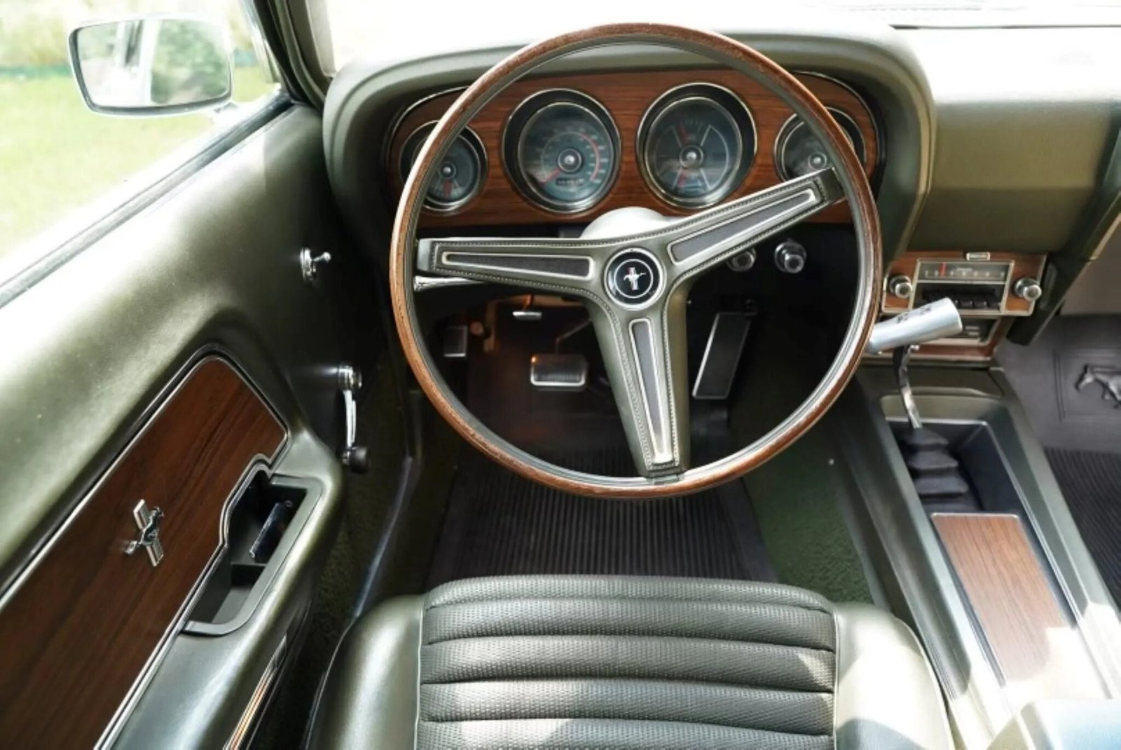 Appointments include woodgrain trim on the dashboard, center console, and door panels as well as a Hurst T-handle shifter, a heater, a dash-mounted clock, Mach 1 badging, Pony-branded rubber floormats, and a Philco push-button radio.