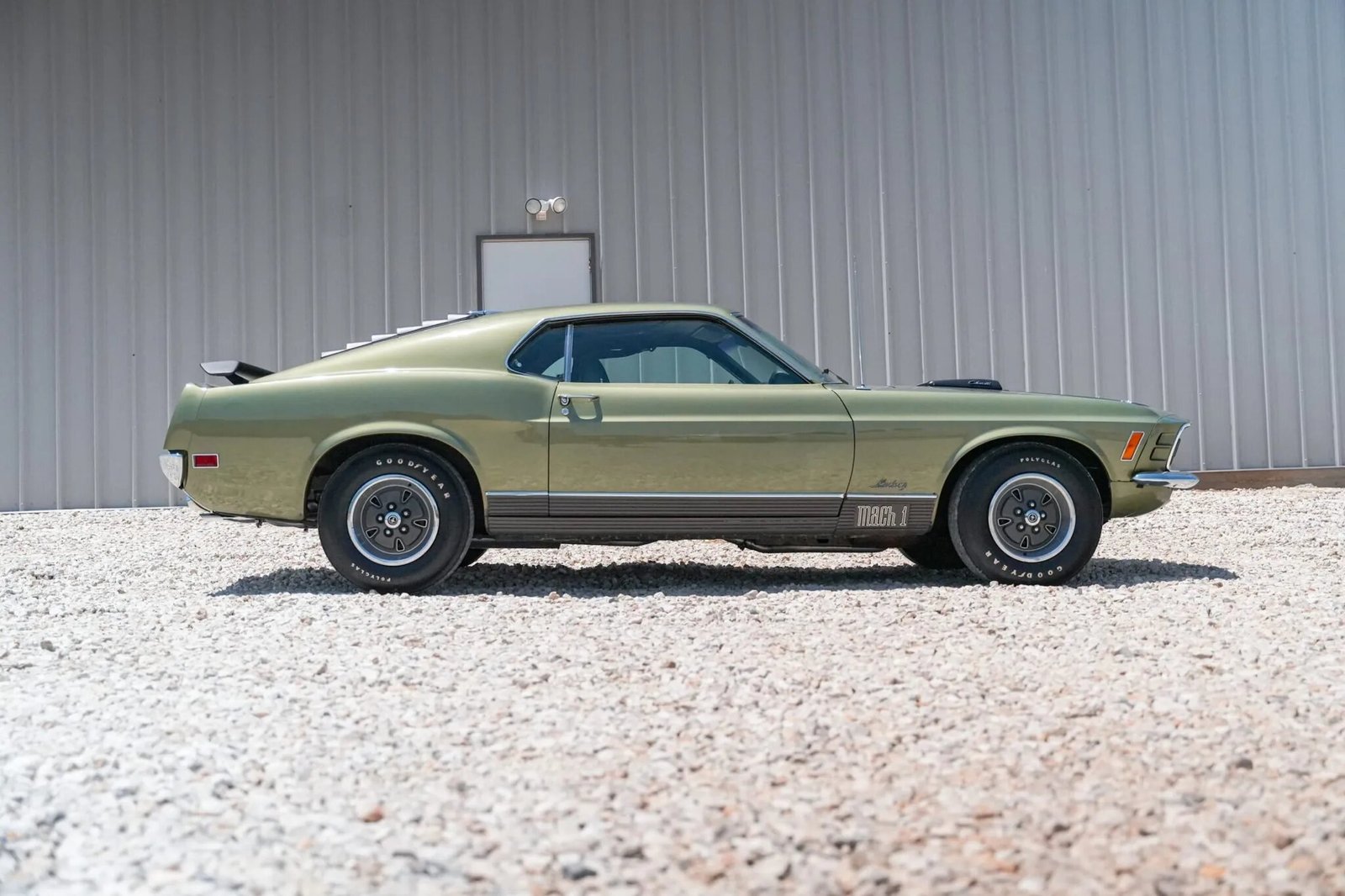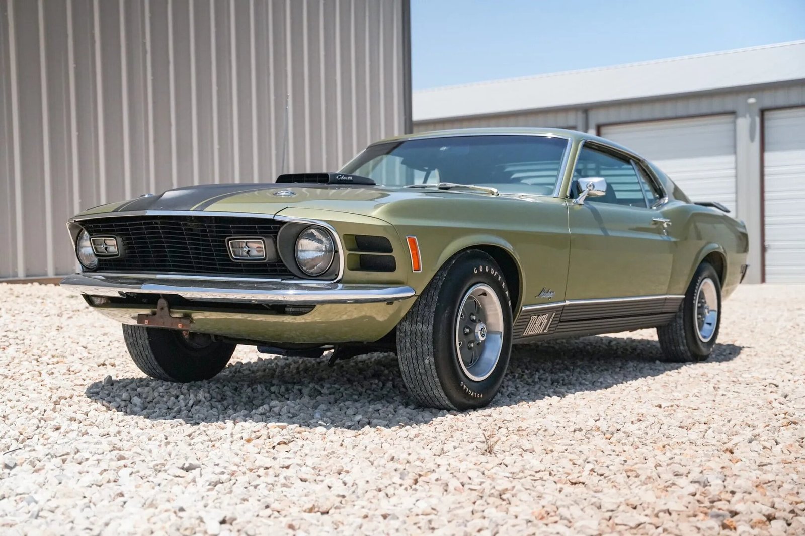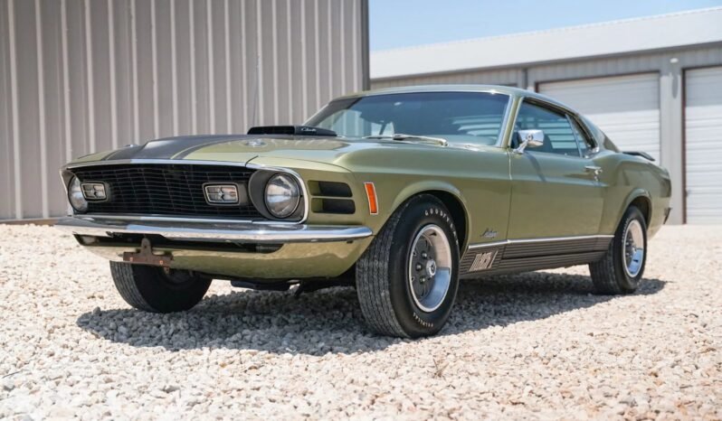 This 1970 Mustang Mach Is powered by a 428ci Super Cobra Jet V8 linked to a four-speed manual transmission and a 3.91:1 Traction-Lok rear axle, and it is finished in green over green vinyl upholstery. Details include the Drag Pack option, a Shaker hood, a black stripe, a grille with integrated indicator lights, front and rear spoilers, rear window louvers, and a Mach 1 tail stripe and rocker moldings as well as power steering, power-assisted front disc brakes, 14″ steel wheels, a T-handle Hurst shifter, and a push-button AM radio.