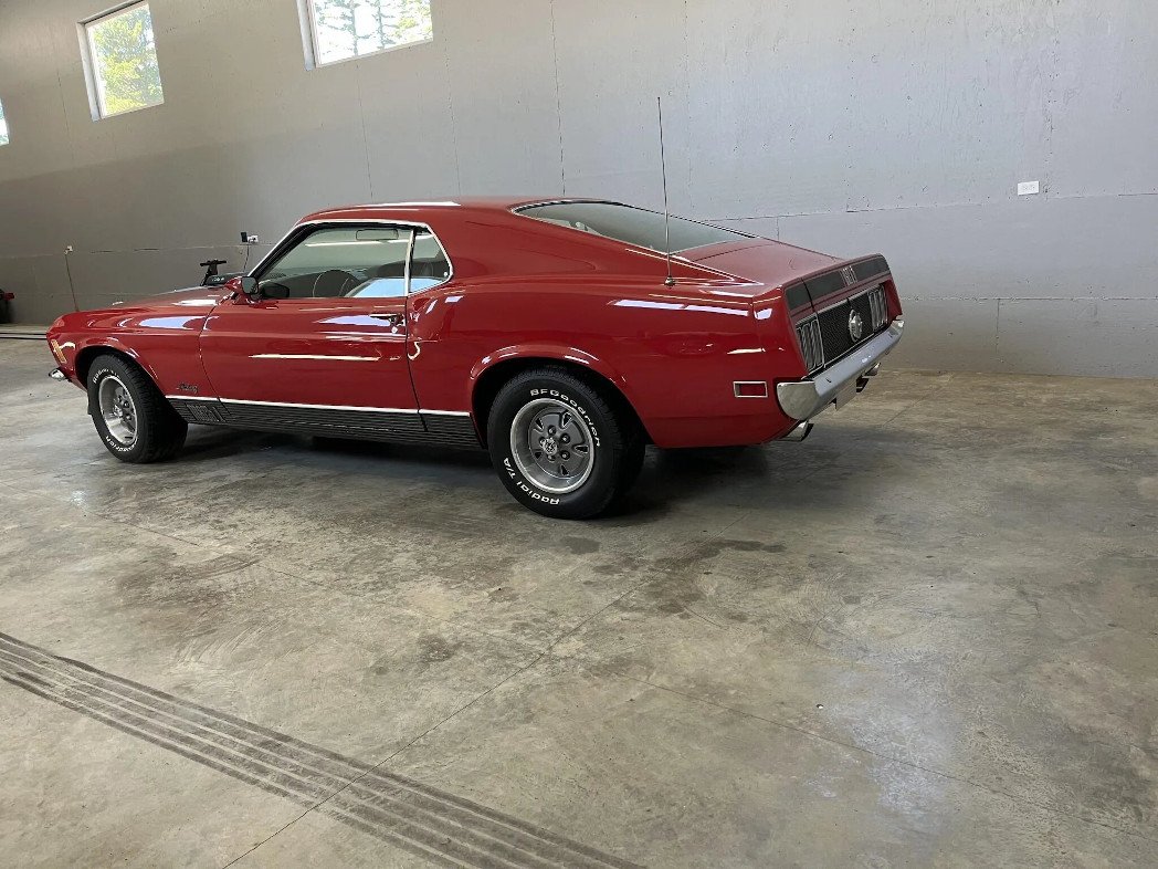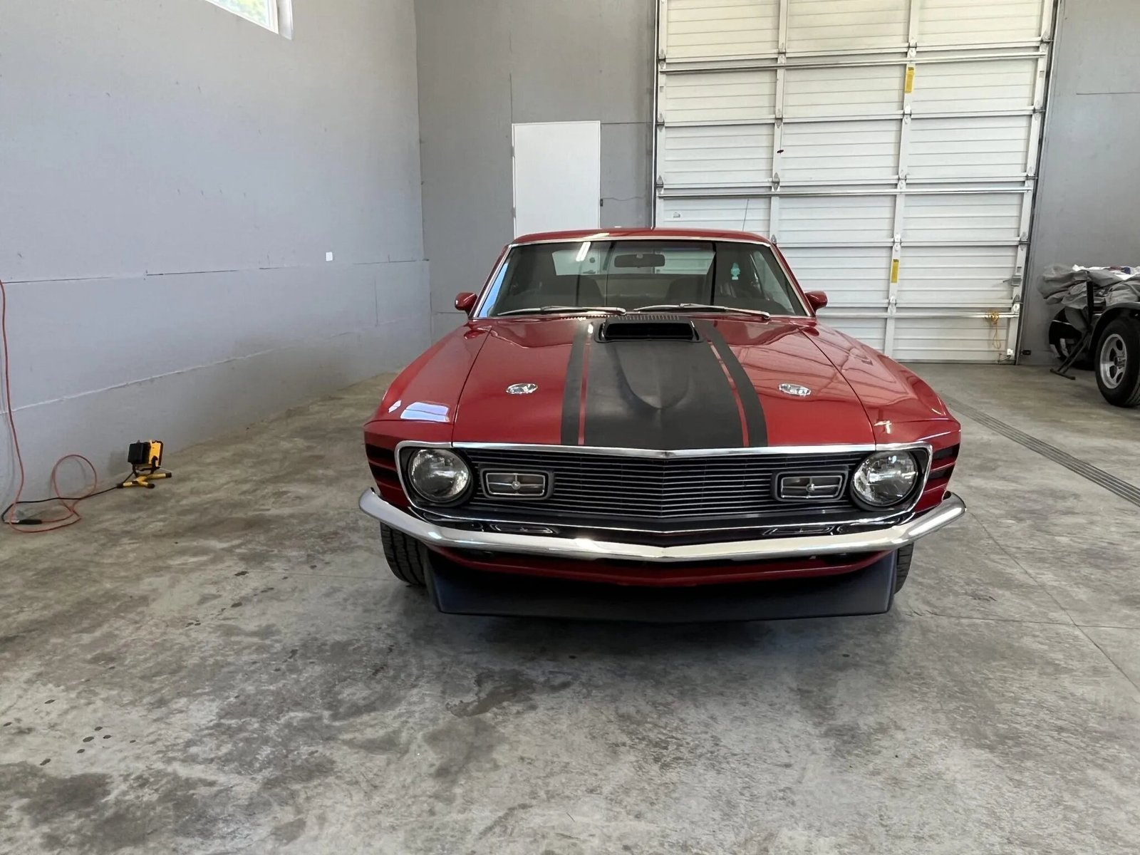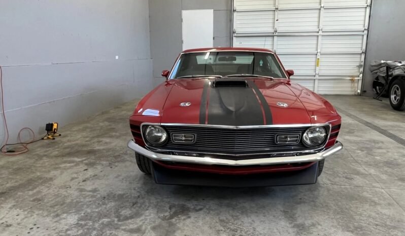 This 1970 Ford Mustang Mach 1 is powered by a 428ci Cobra Jet V8 paired with a three-speed automatic transmission. The car is finished in red over black vinyl and equipment includes fog lights, power steering, power-assisted front disc brakes, 14″ wheels, an AM/FM cassette stereo, and air conditioning.