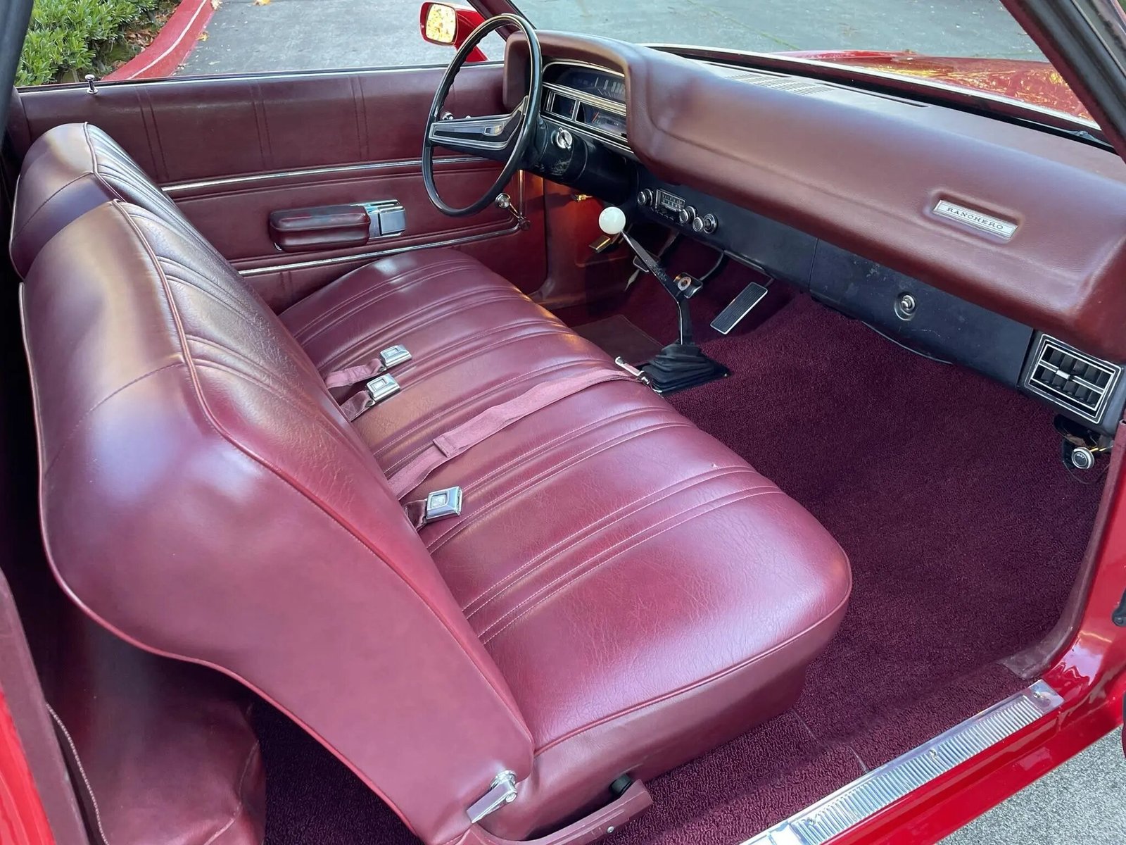 The split bench seat is upholstered in dark red vinyl with a color-coordinated dashboard, door panels, and carpets.