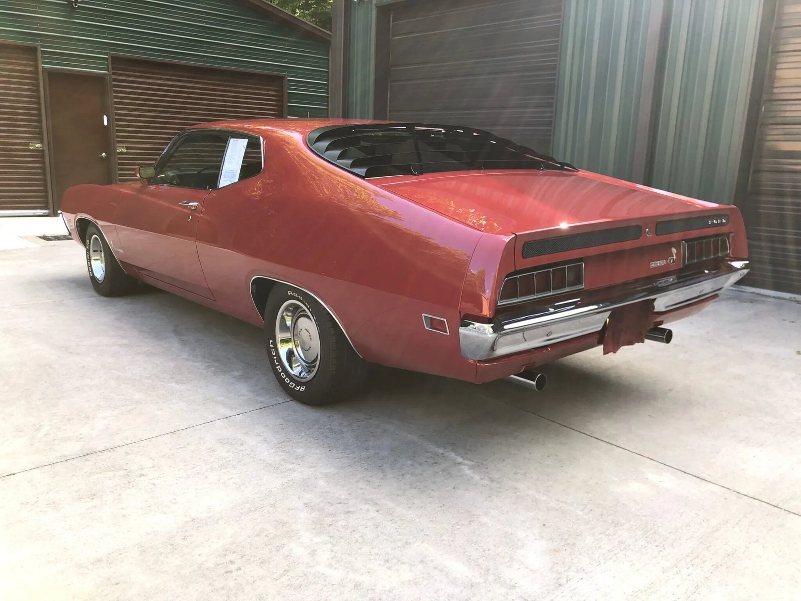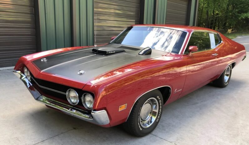 This 1970 Ford Torino Cobra is finished in red over black vinyl and cloth upholstery and is powered by a 429ci Super Cobra Jet V8 paired with a three-speed automatic transmission and a Detroit Locker differential with 4.30:1 gears. Equipment includes a Shaker hood with a scoop and an aftermarket tachometer as well as rear window louvers, 14″ steel wheels with polished hubcaps, power steering, an aftermarket exhaust system, and a Philco push-button radio.