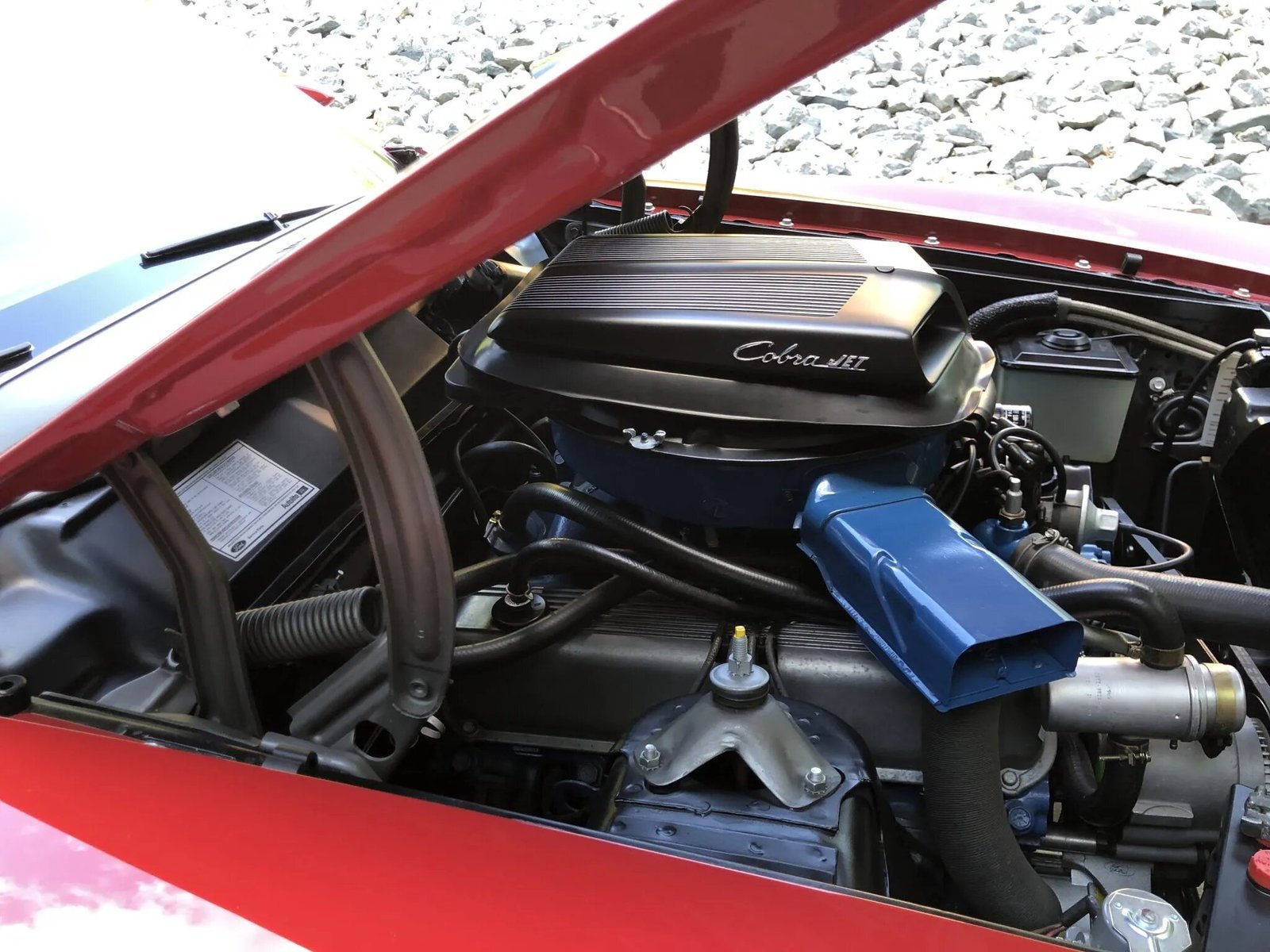 The 429ci Super Cobra Jet V8 features forged aluminum pistons, a solid-lifter camshaft, header-style exhaust manifolds, and an oil cooler.