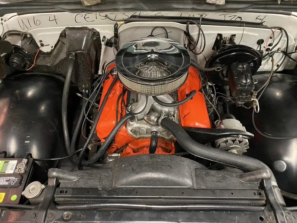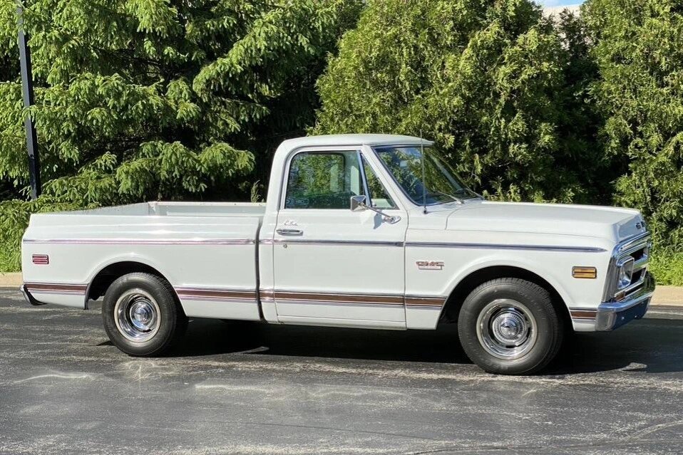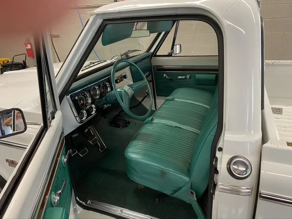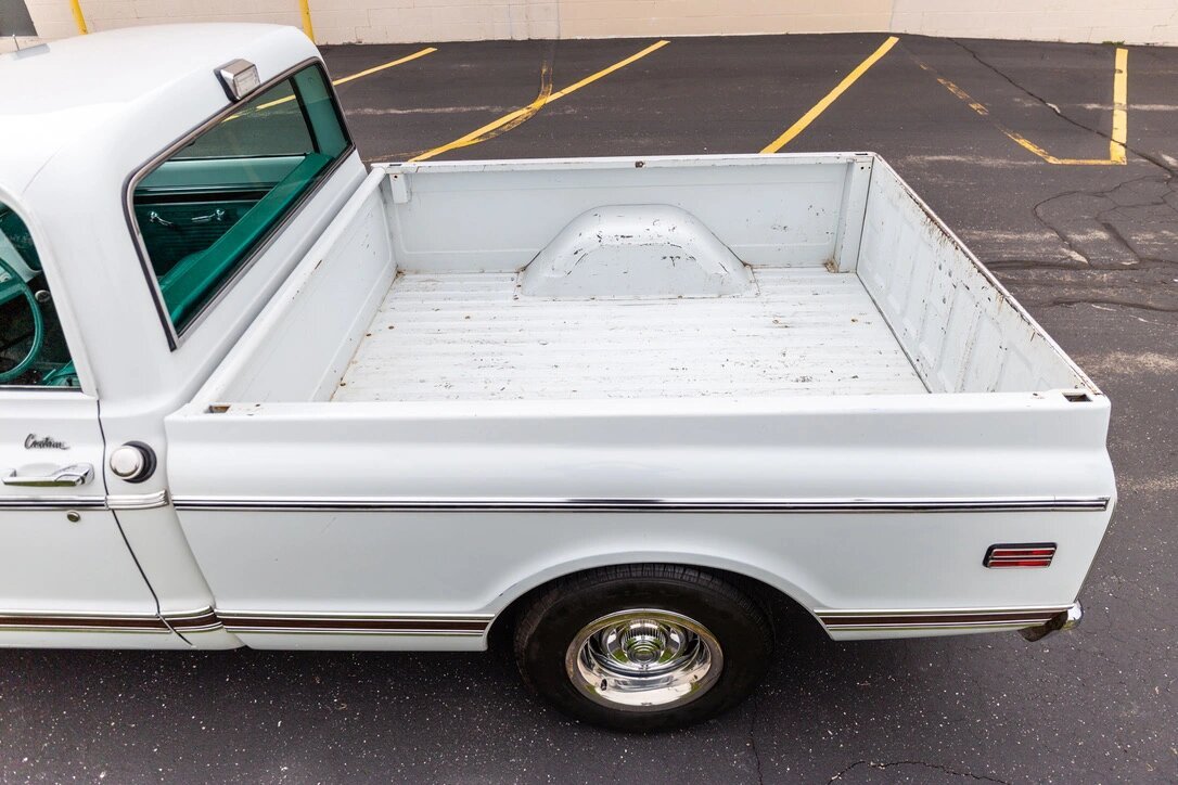Finished in white with a green vinyl interior, the truck is powered by a 402ci L47 V8 paired with a four-speed M20 manual transmission and equipped with power steering and brakes.