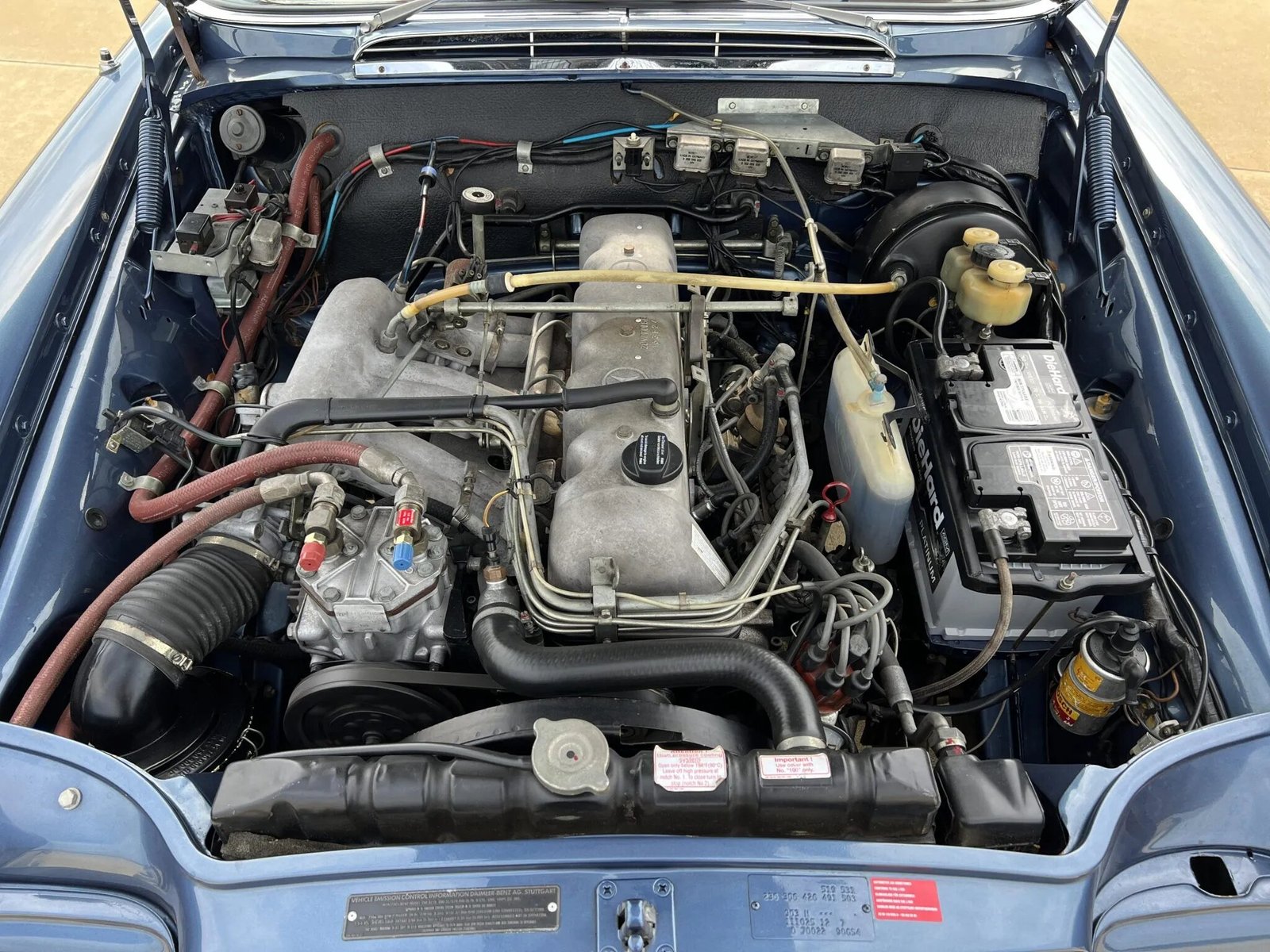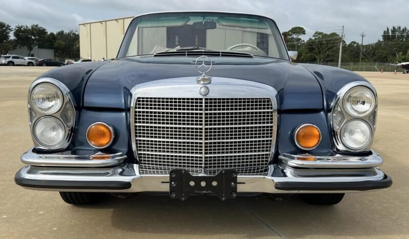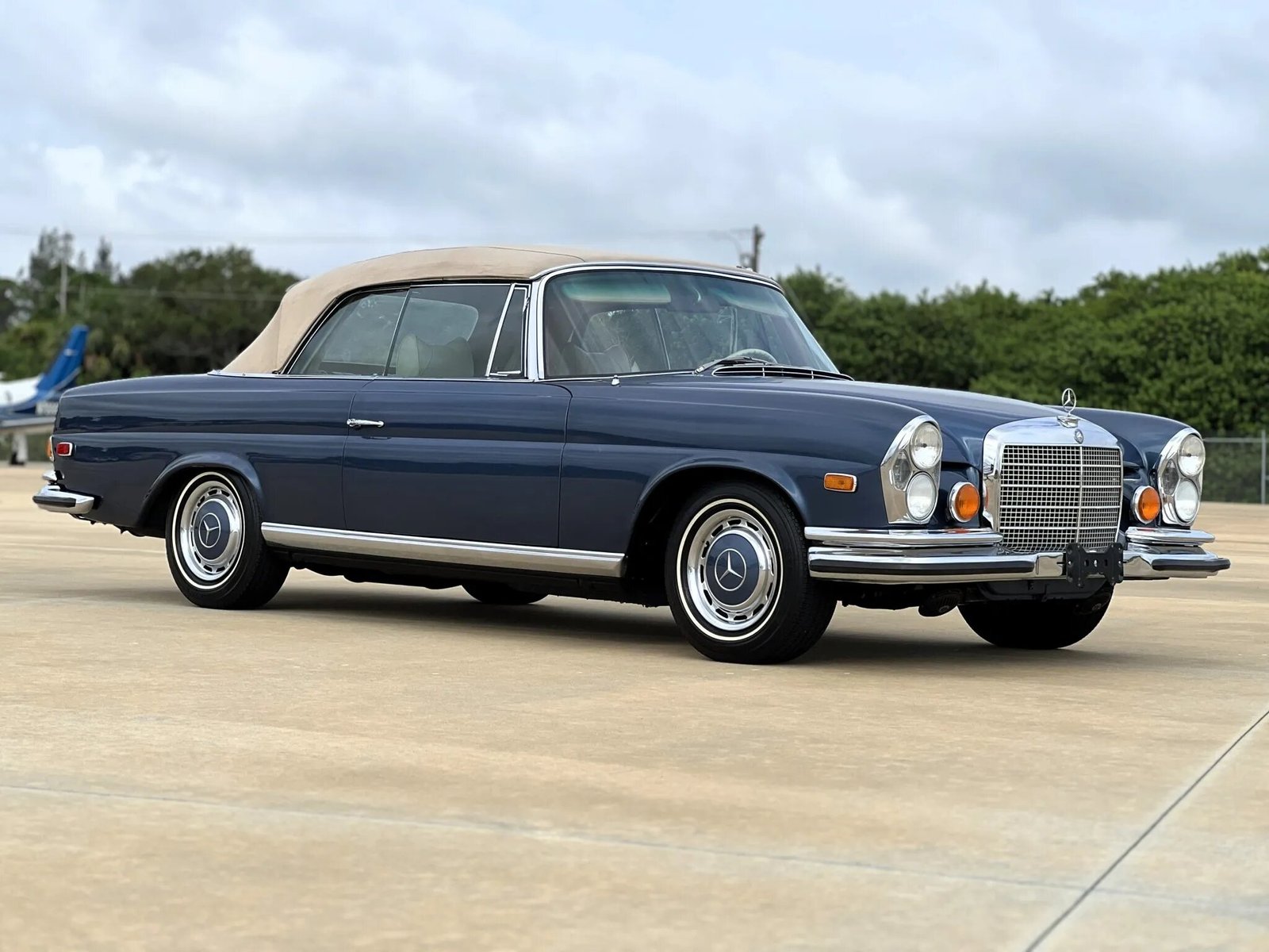 This 1970 Mercedes-Benz 280SE cabriolet is one of approximately 1,390 examples produced between 1968 and 1971, and it was restored by Hatch & Sons Automotive. The car is powered by a 2.8-liter inline-six paired with a four-speed automatic transmission and is finished in blue over Light Beige leather. Equipment includes a tan convertible top, 14″ steel wheels with covers, disc brakes, US-specification headlights, three-point seat belts, a Becker Grand Prix stereo, and air conditioning.