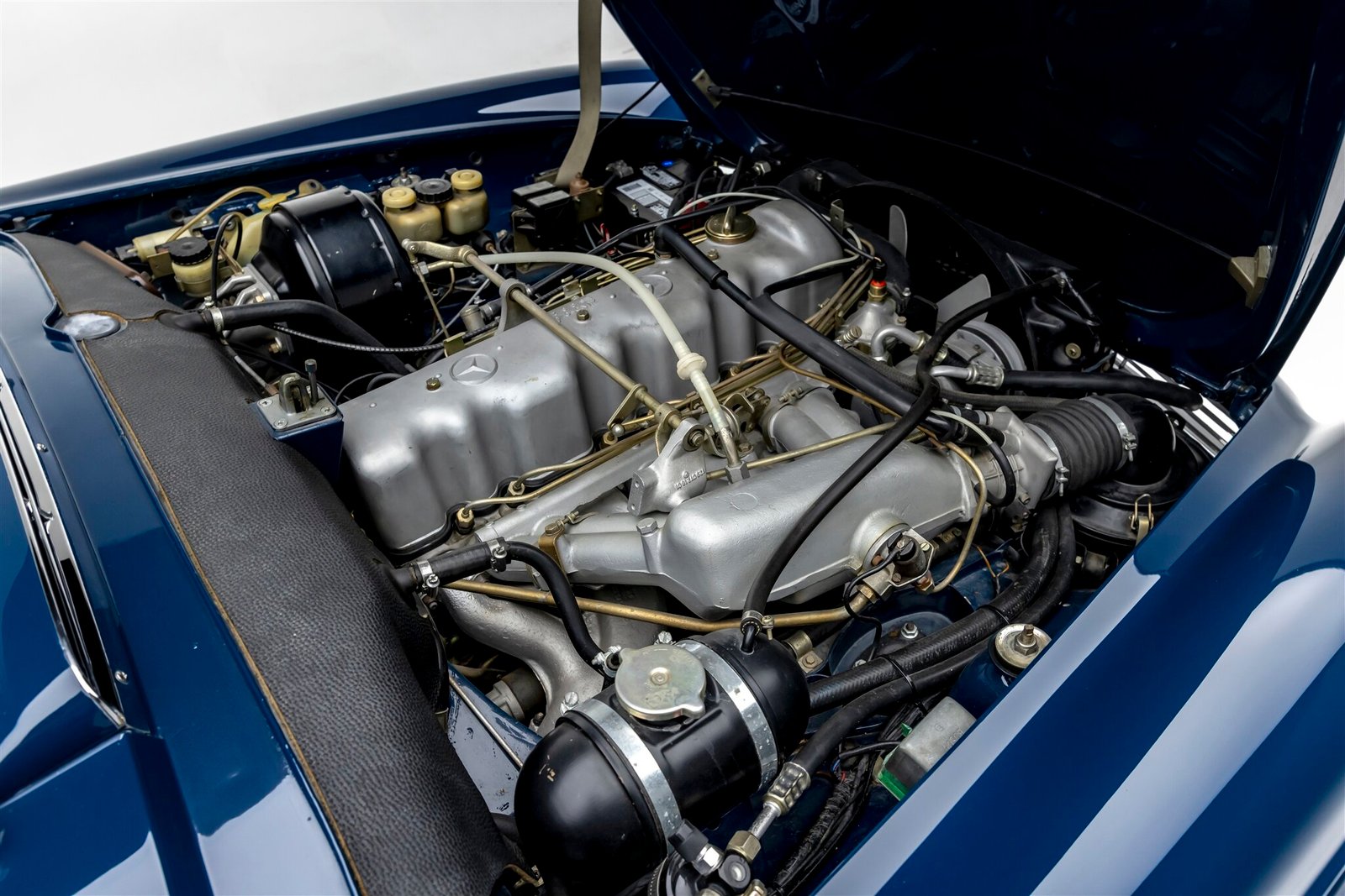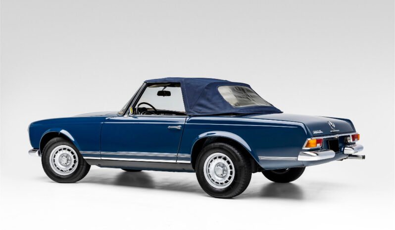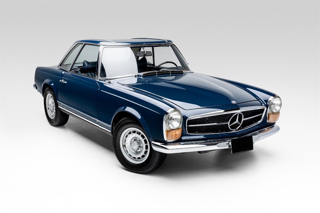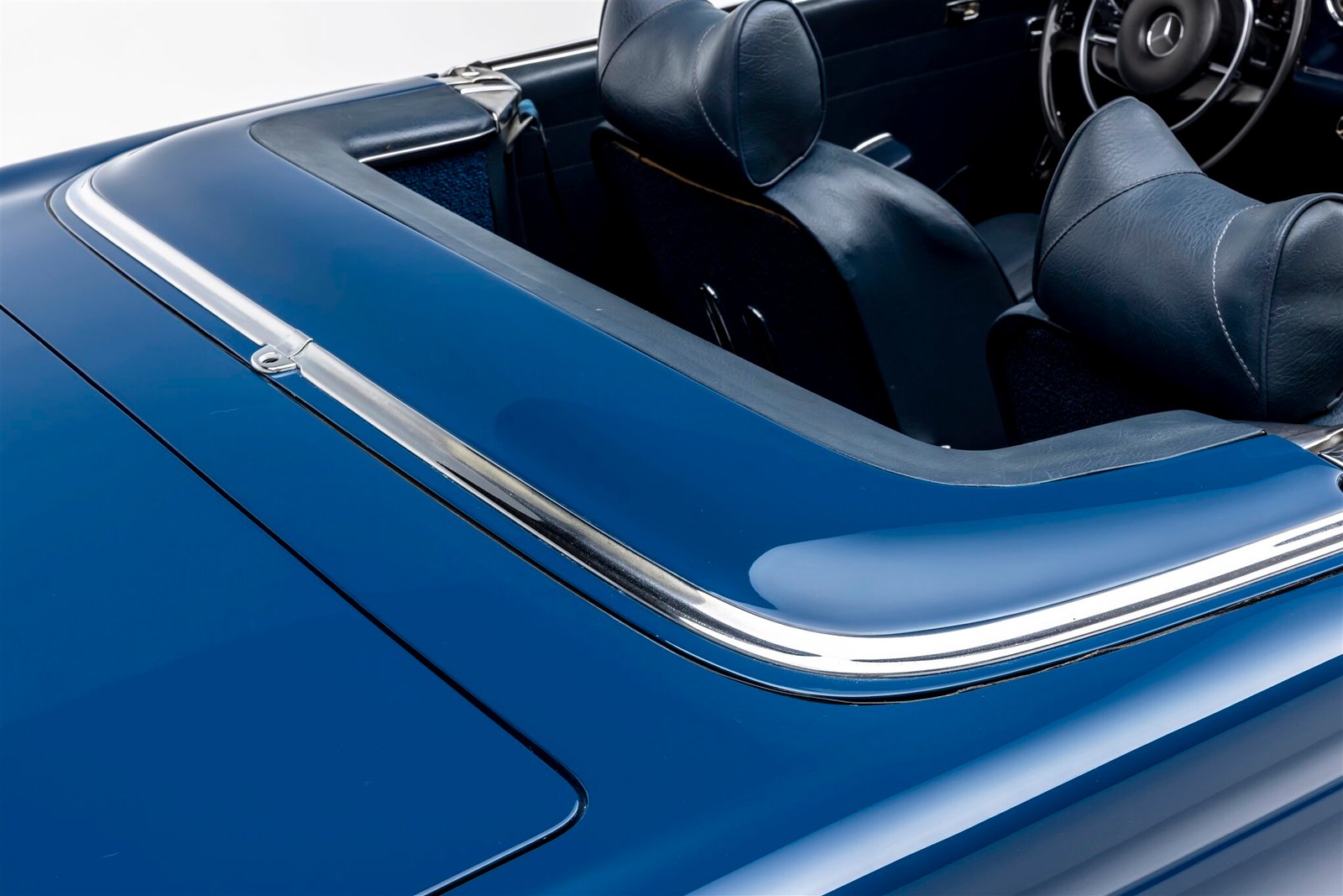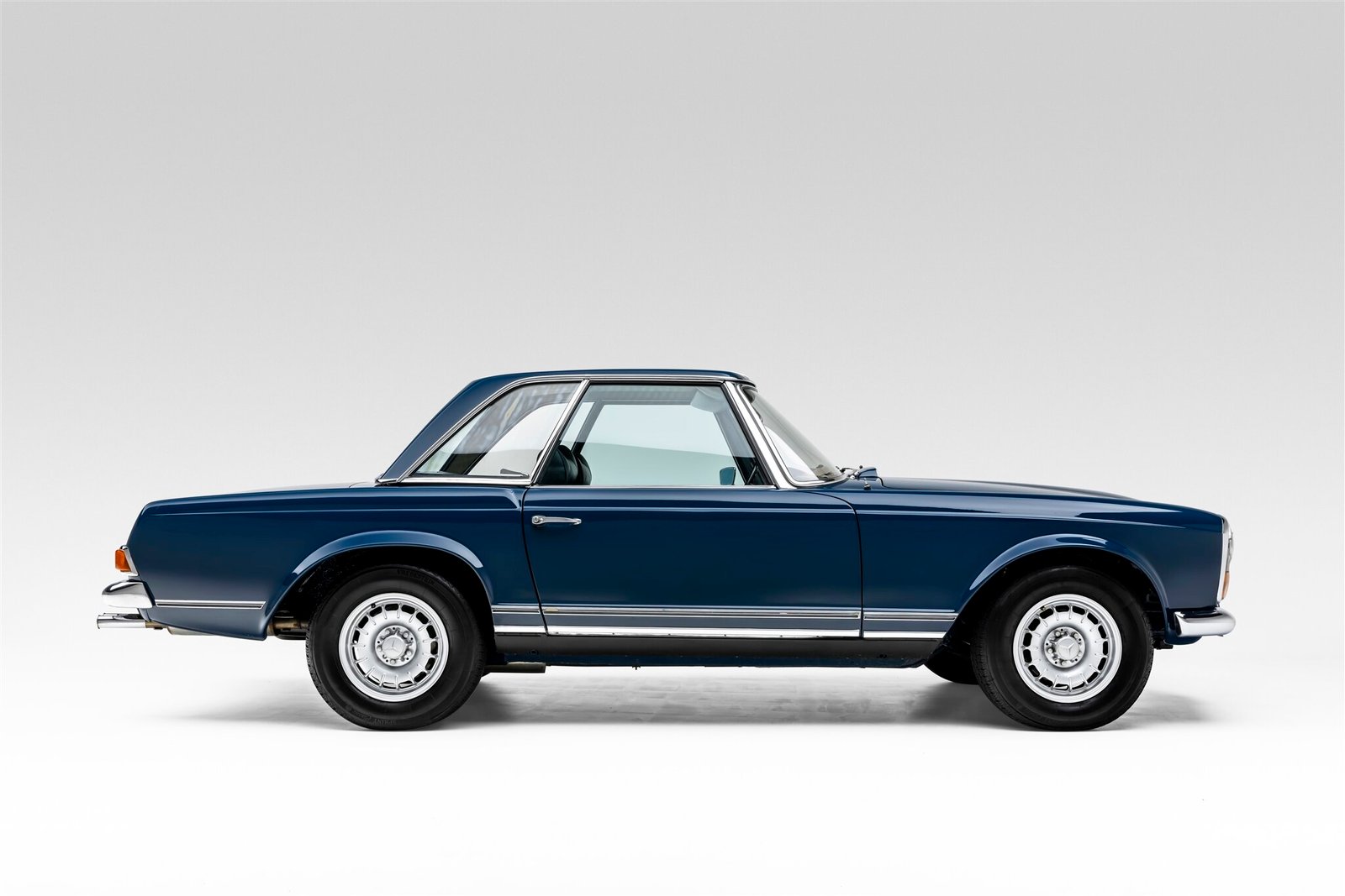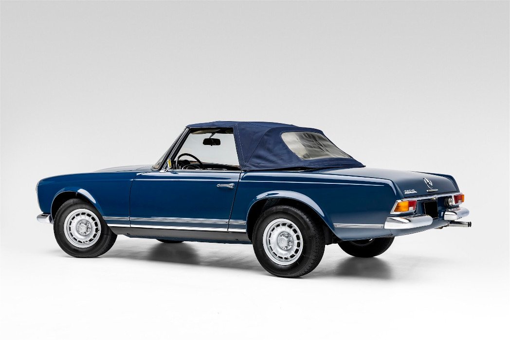 This 1970 Mercedes-Benz 280SL is finished in Medium Blue over blue MB-Tex upholstery and powered by a 2.8-liter inline-six paired with a four-speed manual transmission.