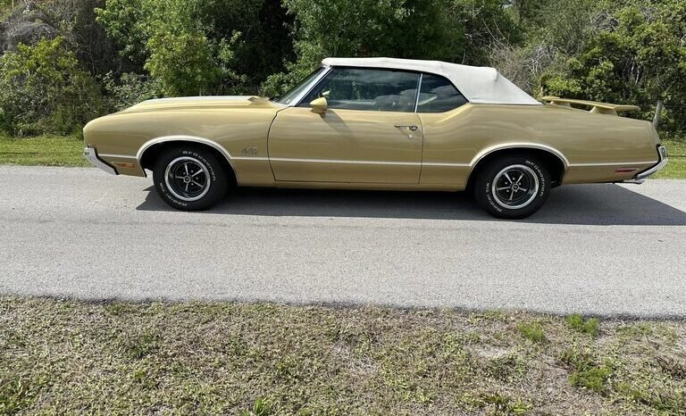 Equipment includes a power-operated white convertible top, quad headlamps, a rear wing, a W-30-style fiberglass hood with air intake ducts as well as sports-styled mirrors and bright metal wheel arch moldings.