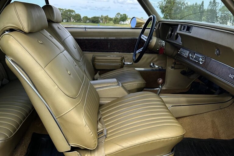 The car is powered by a replacement 455ci V8 mated to a TH400 three-speed automatic transmission and is finished in Galleon Gold with white stripes over gold vinyl upholstery.