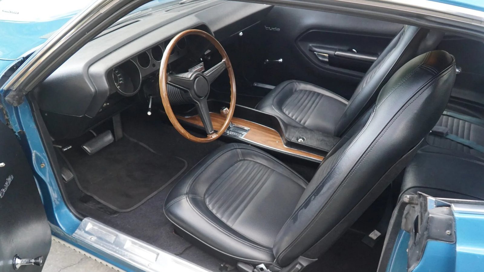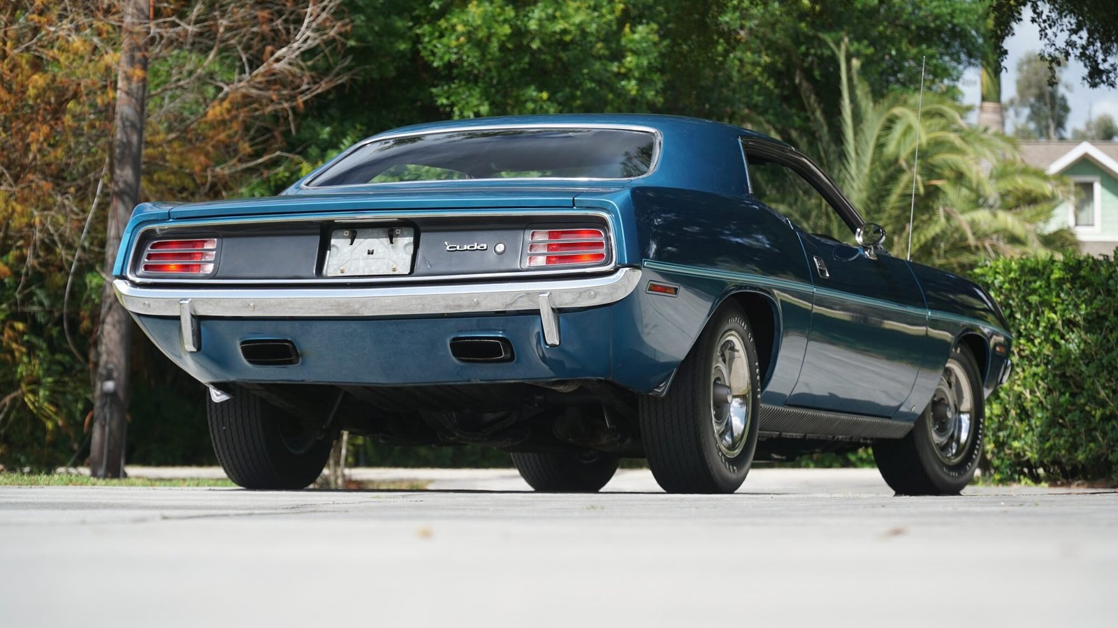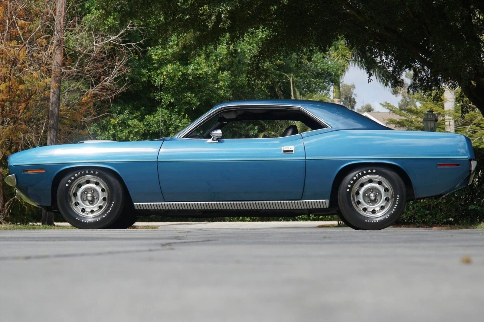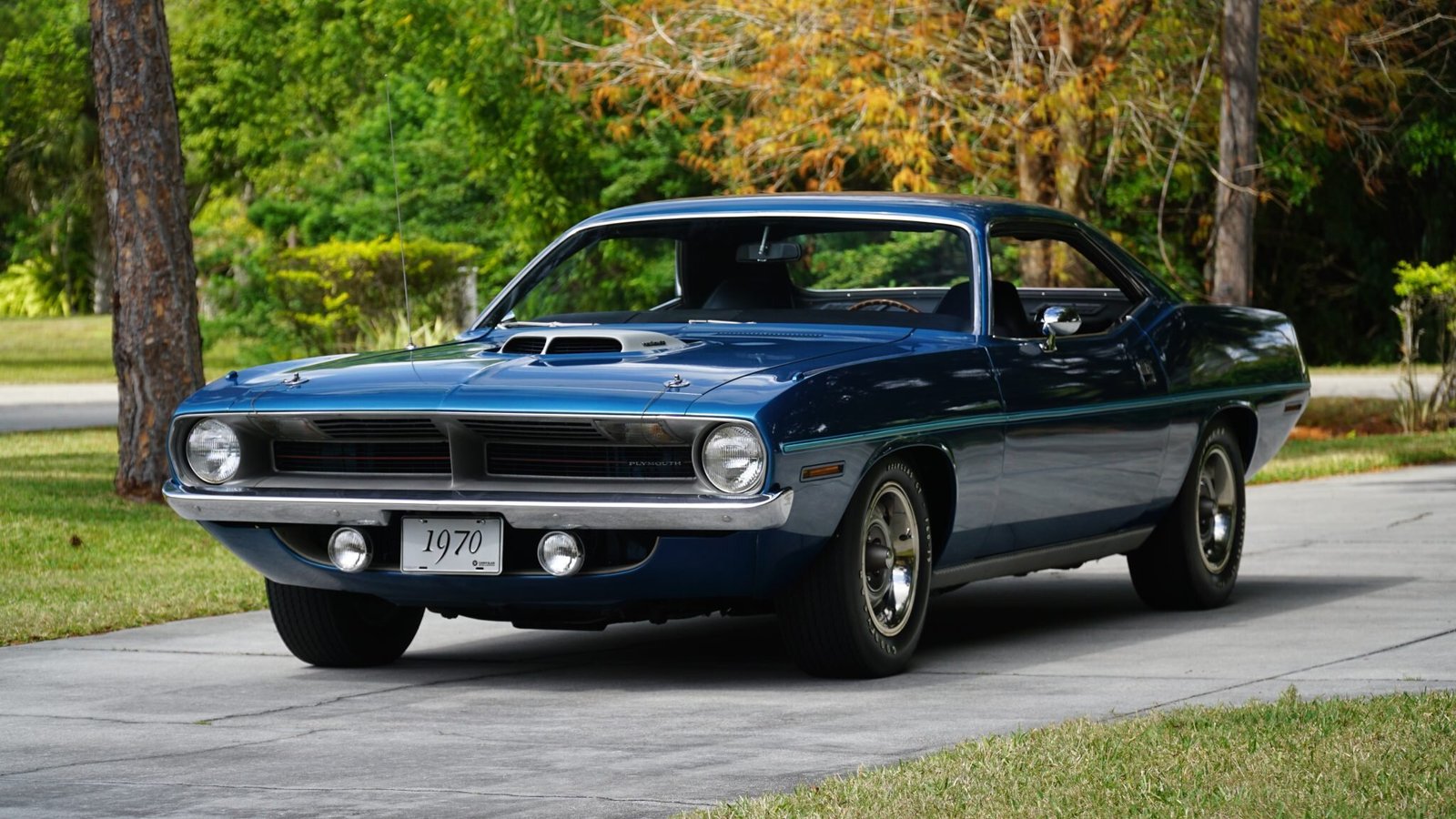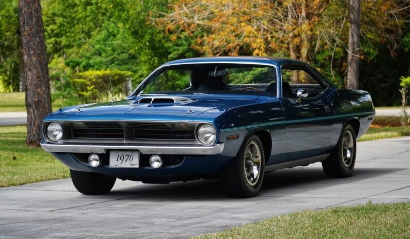 This 1970 Plymouth ’Cuda coupe is one of approximately 368 examples produced with a 426ci Hemi V8 and a 727 TorqueFlite automatic transmission for the model year. Finished in Jamaica Blue Metallic over a black vinyl interior, the car features a Shaker hood with an exposed intake and hood pins, 15″ Rallye wheels, front fog lamps, a Chrysler AM radio, a Realistic FM stereo, and the A32 Super Performance Package, which added a 4.10:1 Sure-Grip differential and power-assisted front disc brakes.