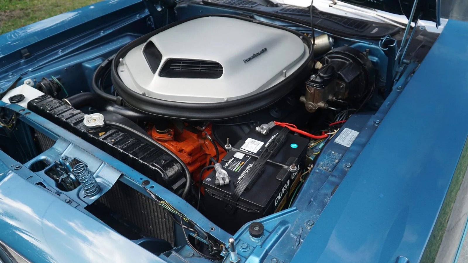 The numbers-matching E74-code 426ci Hemi V8 is equipped with dual Carter four-barrel carburetors and was factory rated at 425 horsepower and 490 lb-ft of torque.