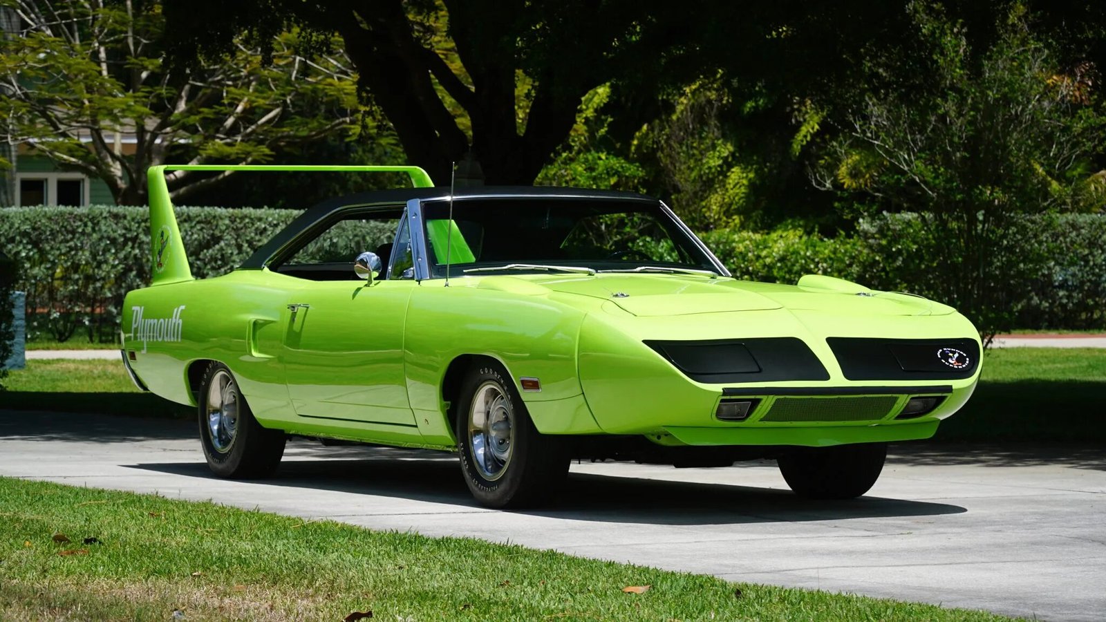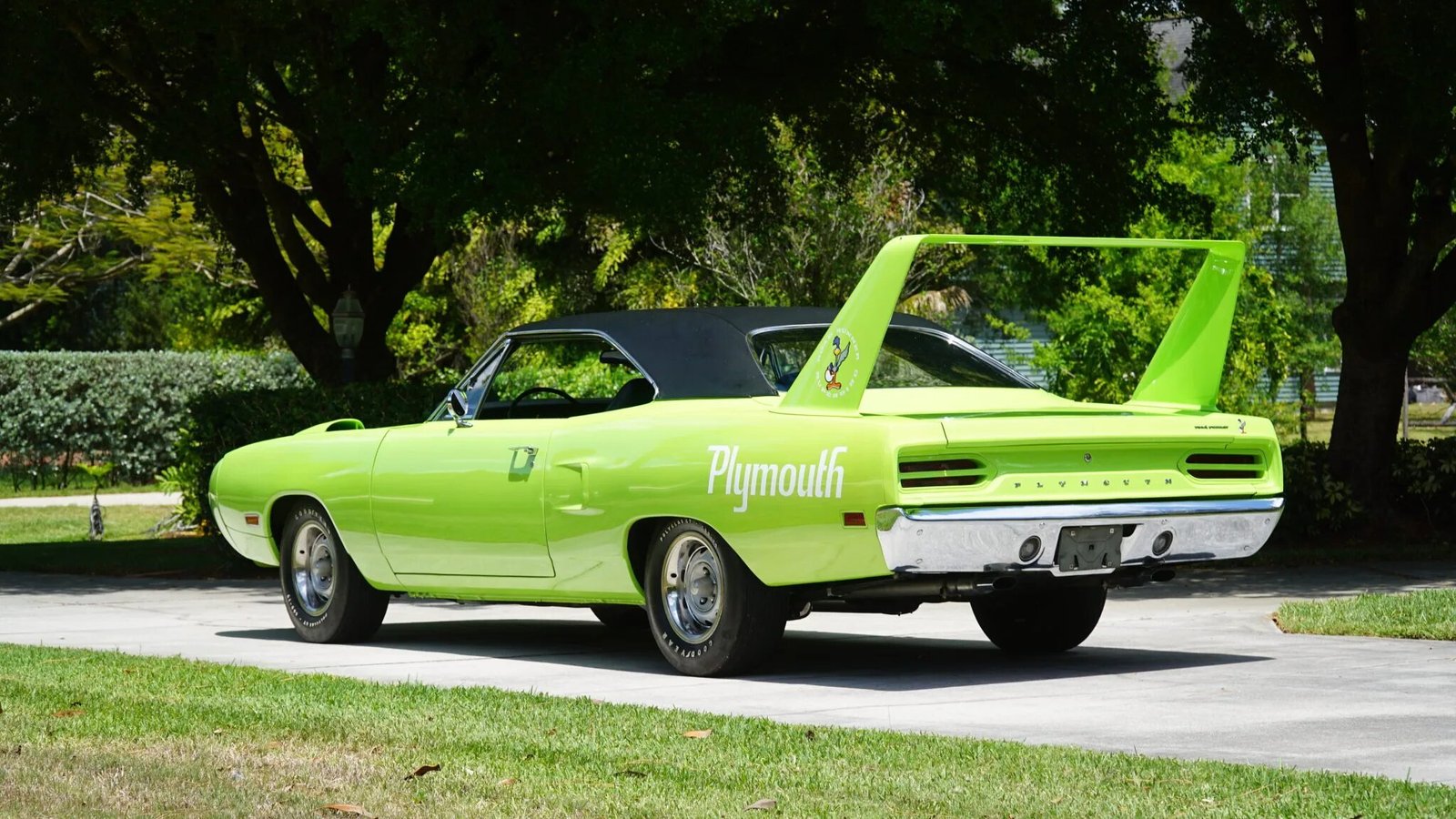 This 1970 Plymouth Superbird is finished in green with a black vinyl top over a black interior and is powered by a numbers-matching 440ci V8 paired with a replacement Torqueflite three-speed automatic transmission.
