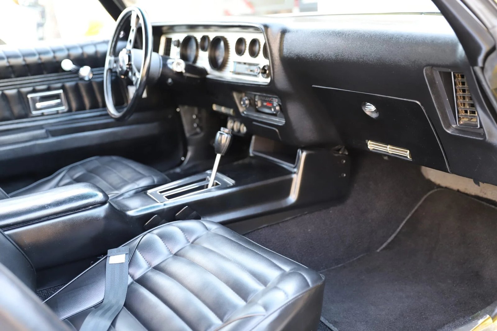 The cabin features front and rear bucket seats upholstered in black vinyl joined by a color-matching dashboard, door panels, and carpets.