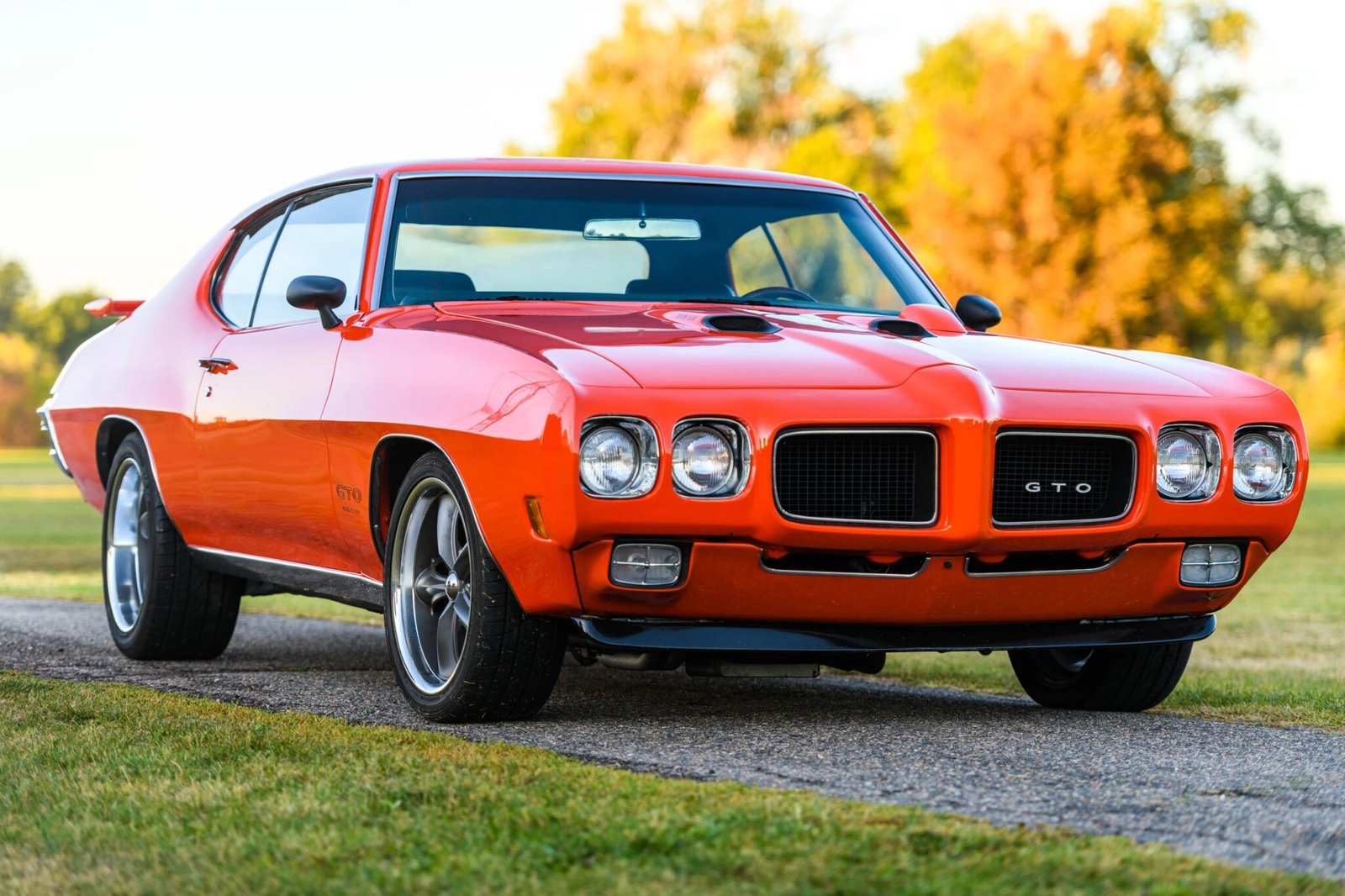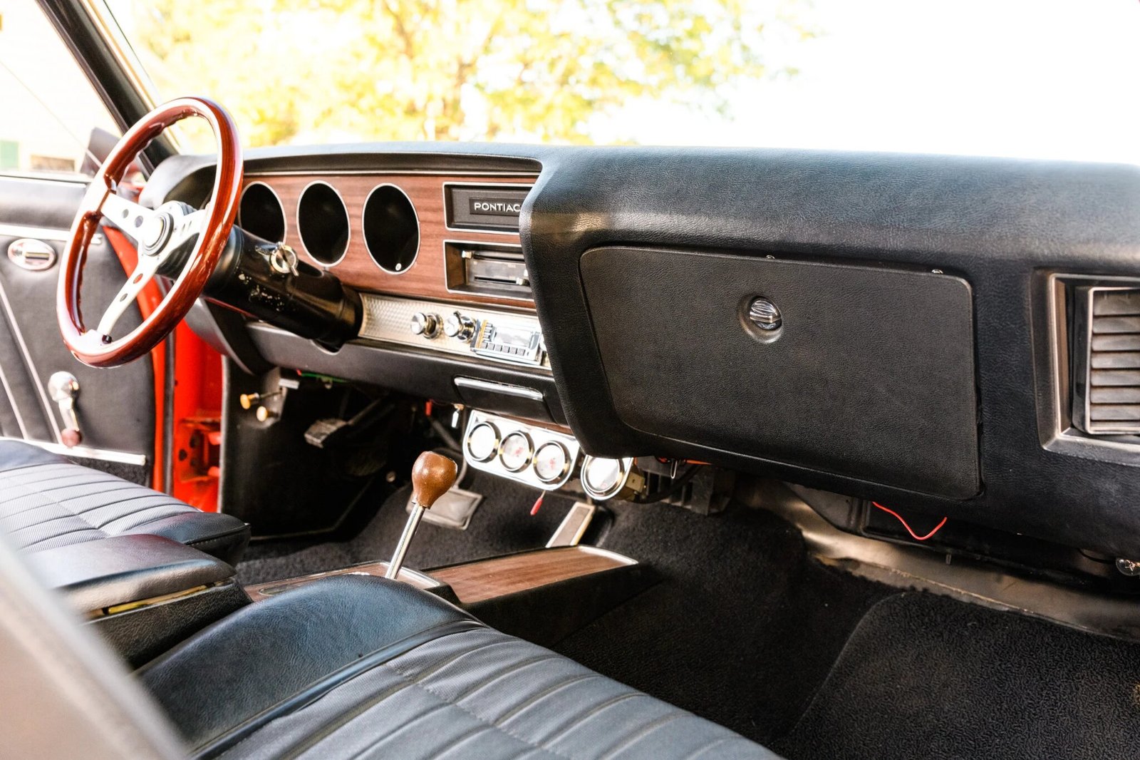 Accessory gauges are mounted to the underside of the dash, and a wood-rimmed Grant steering wheel is equipped.