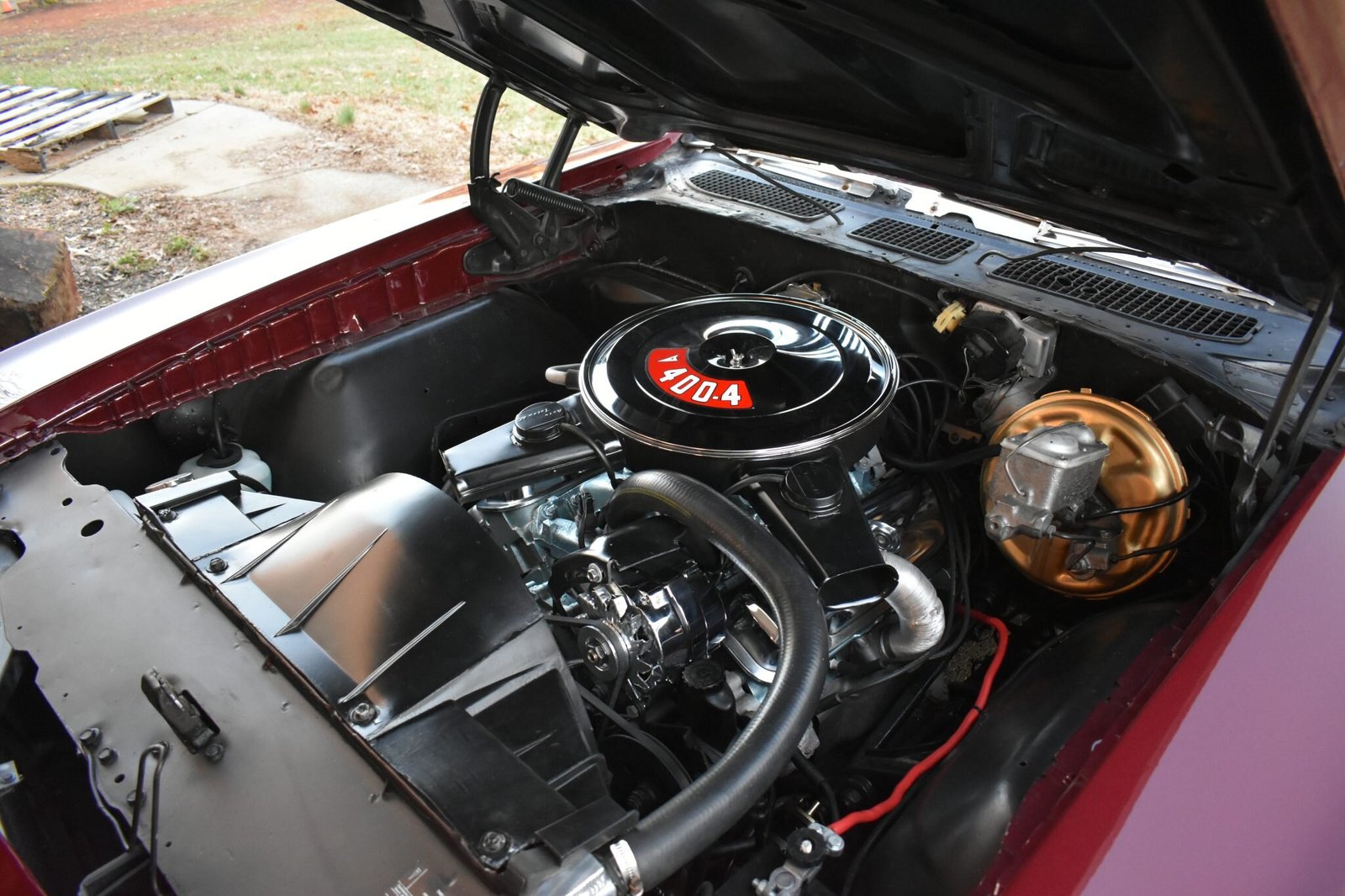 The 400ci V8 is equipped with a four-barrel carburetor and chrome valve covers.