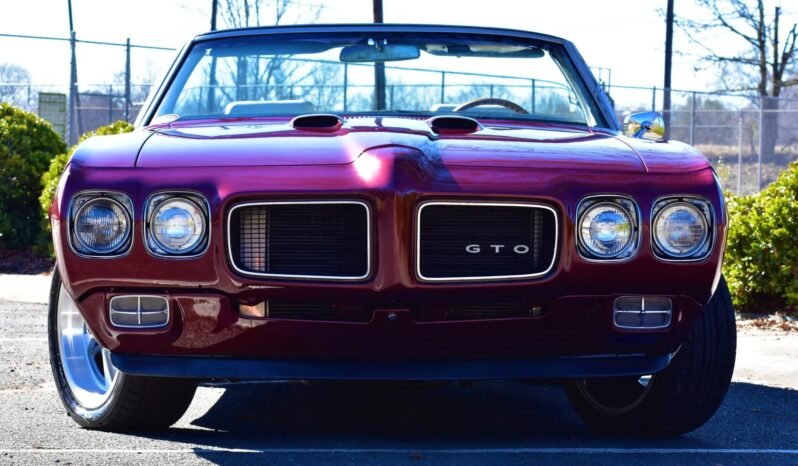 This 1970 Pontiac GTO convertible was refurbished under prior ownership and is powered by a 400ci V8 paired with a three-speed automatic transmission. The car is finished in metallic red with a black soft top over white vinyl upholstery, and equipment includes quick-ratio power steering, a Flowmaster dual exhaust system, 17″ aluminum wheels, and power-assisted front disc brakes as well as chrome trim, a white top boot, a center console, a tachometer, and a push-button AM radio with an 8-track tape player.