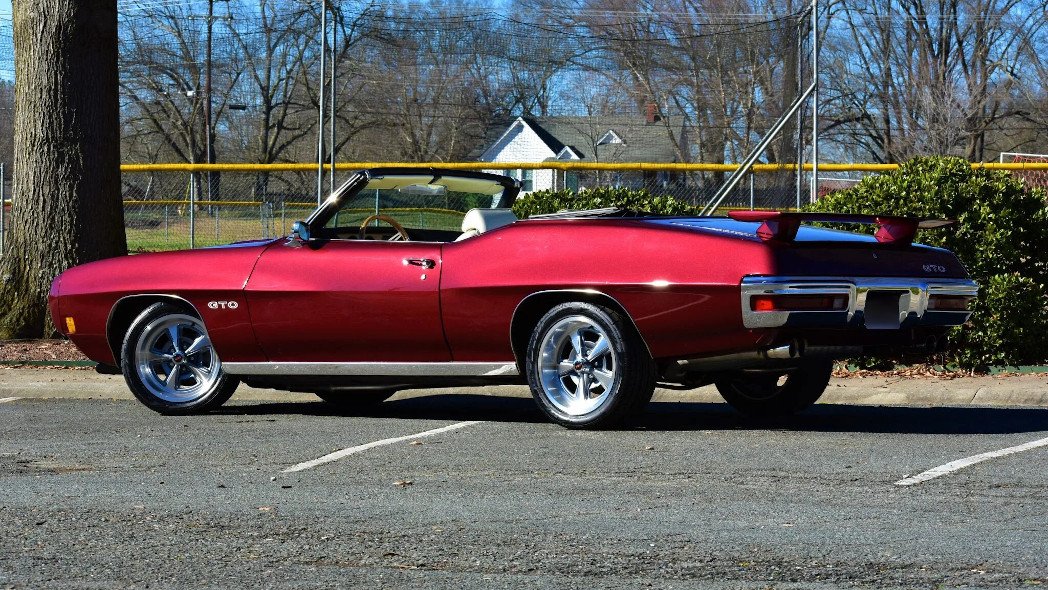 The body was repainted in its current shade of metallic red, exterior details include a power-operated black soft top with a white boot cover as well as an Endura front bumper, GTO badging, a front spoiler, a rear wing, a pair of hood-mounted air intakes, quad-exit polished exhaust tips, and chrome trim on the rear bumper, wheel arches, and rocker panels.
