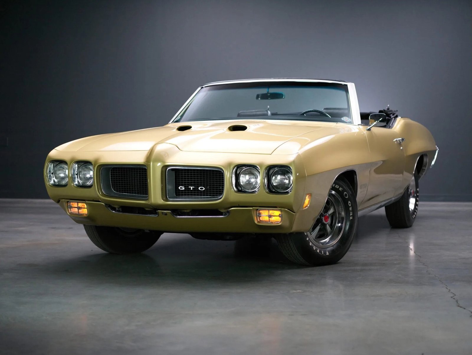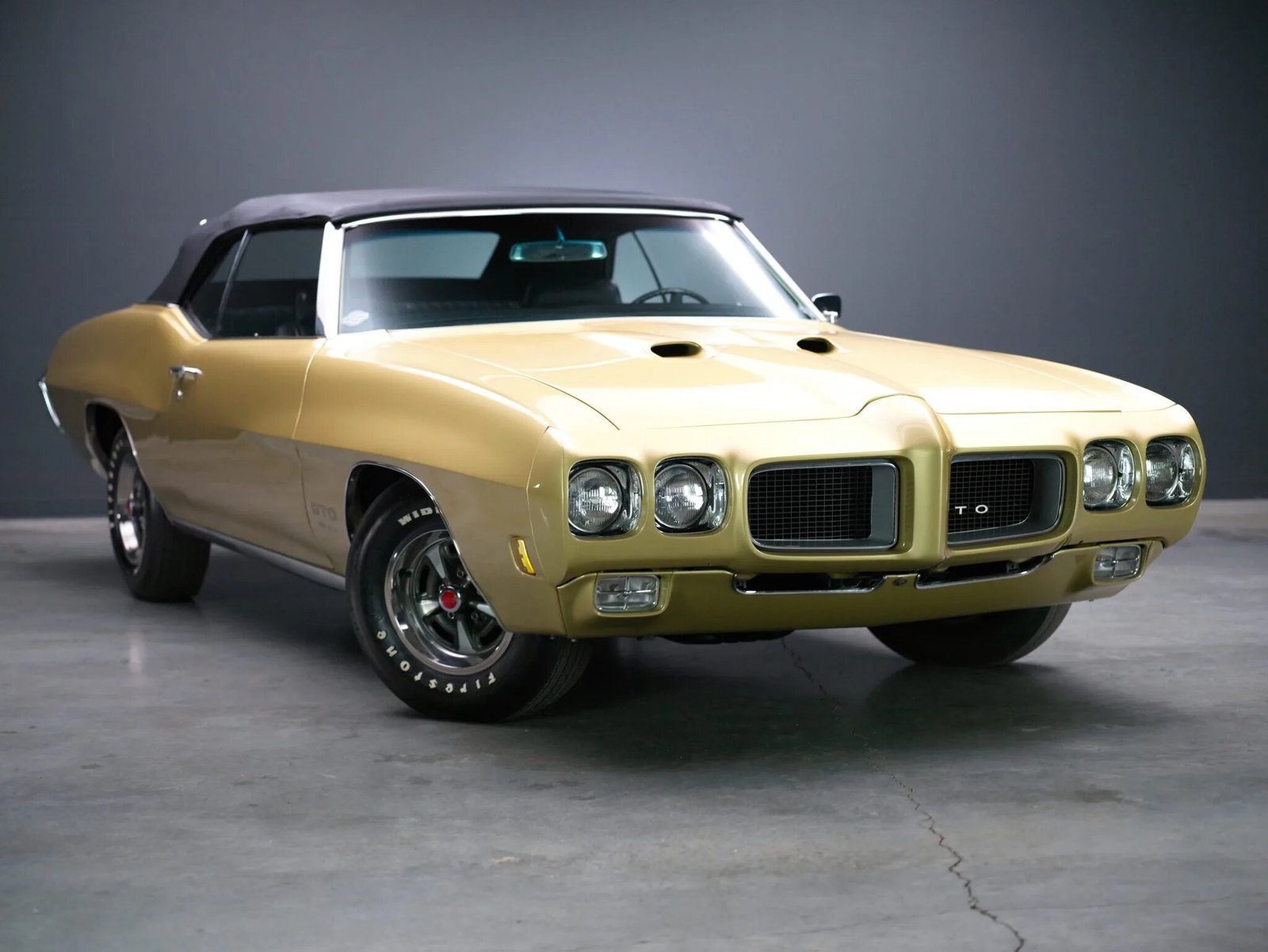 Equipment includes a Ram Air pull switch on the dashboard, faux woodgrain trim, a Hurst shift lever, retractable lap belts, polished door sills, Pontiac-branded floor mats, and a push-button AM/FM radio.