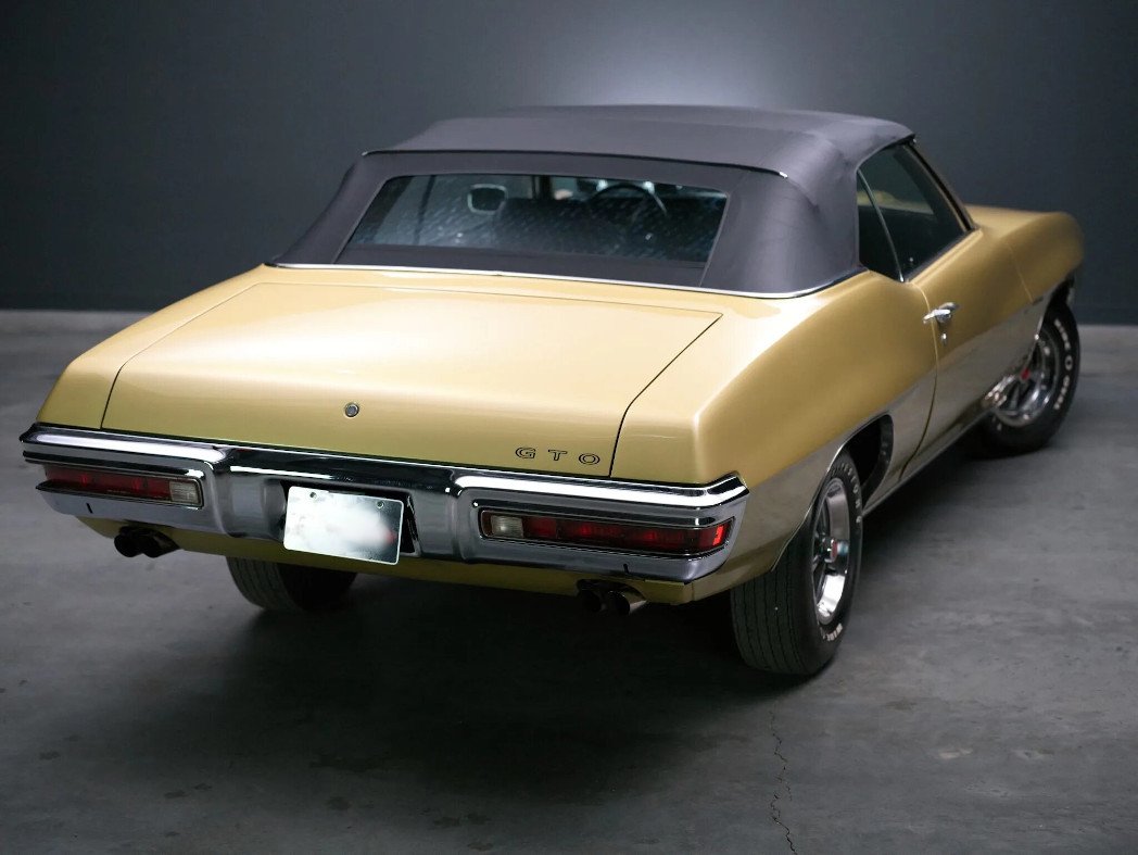 Features include a powered black convertible soft top, Ram Air hood, Endura front bumper, quad headlamps, bright finished rocker trim, and dual exhaust outlets that exit below the chrome rear bumper.